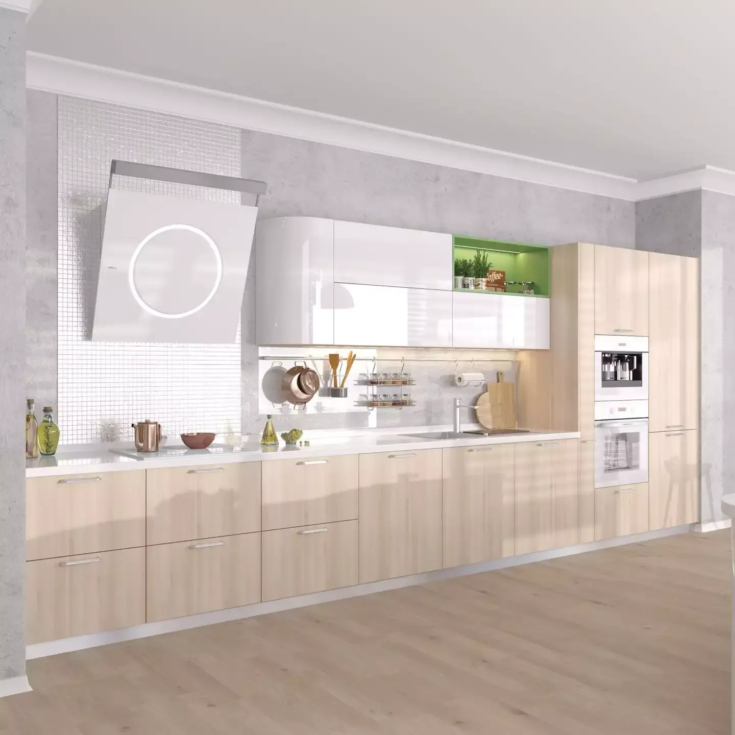 Кухонный гарнитур, состоящий из трех отдельных элементов: кухни, острова и буфета, в качестве которого выступает шкаф-купе. Кухня очень светлая, в декоре использовано много белых элементов с зелеными включениями. Кухонный остров имеет необычную форму со скругленными краями. Он полностью образует рабочую поверхность и может служить в качестве барной стойки.