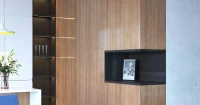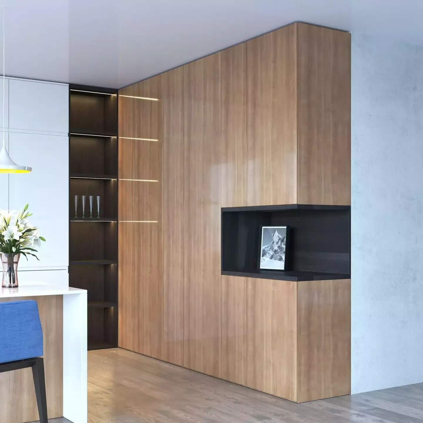 Стеновая панель и фасады под дерево «Орех Опера» покрыты лаком СенсоГлосс.