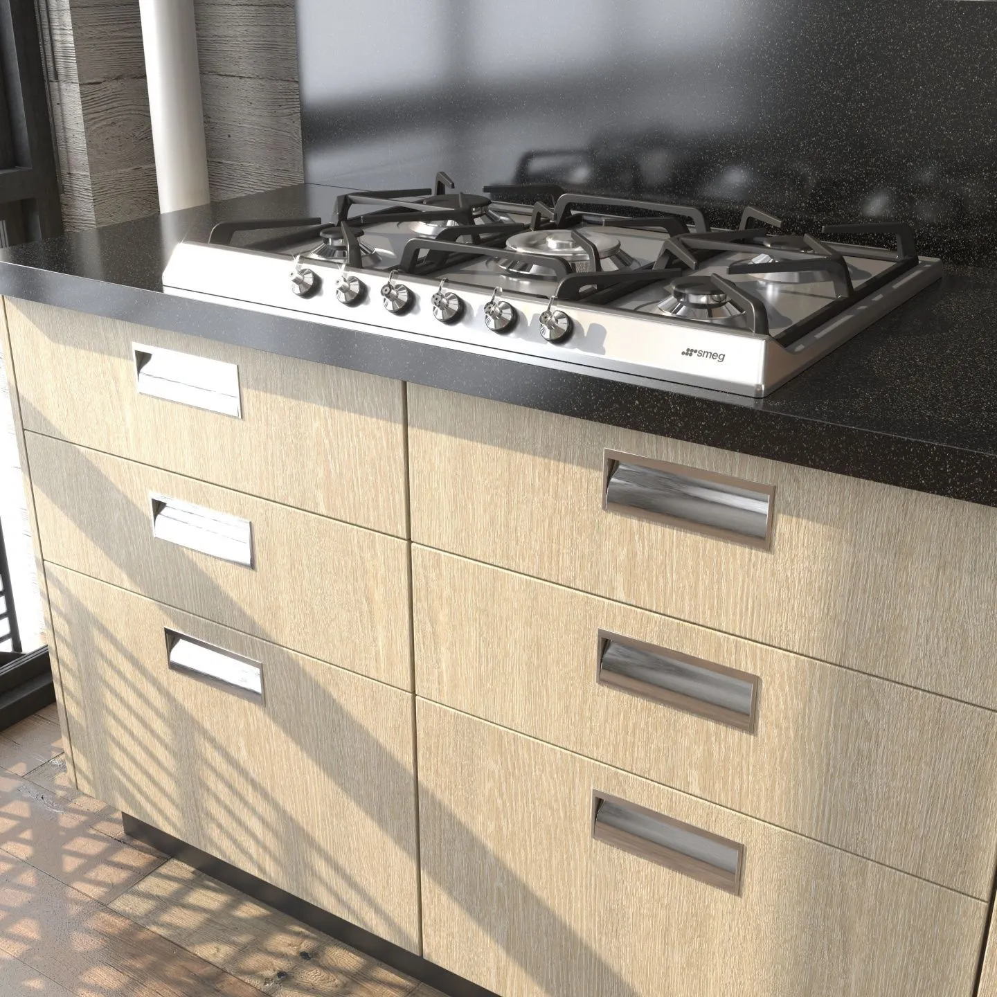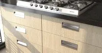 Фасады изготовлены из МДФ в пленке «Античный дуб» с врезными ручками «Ригола».