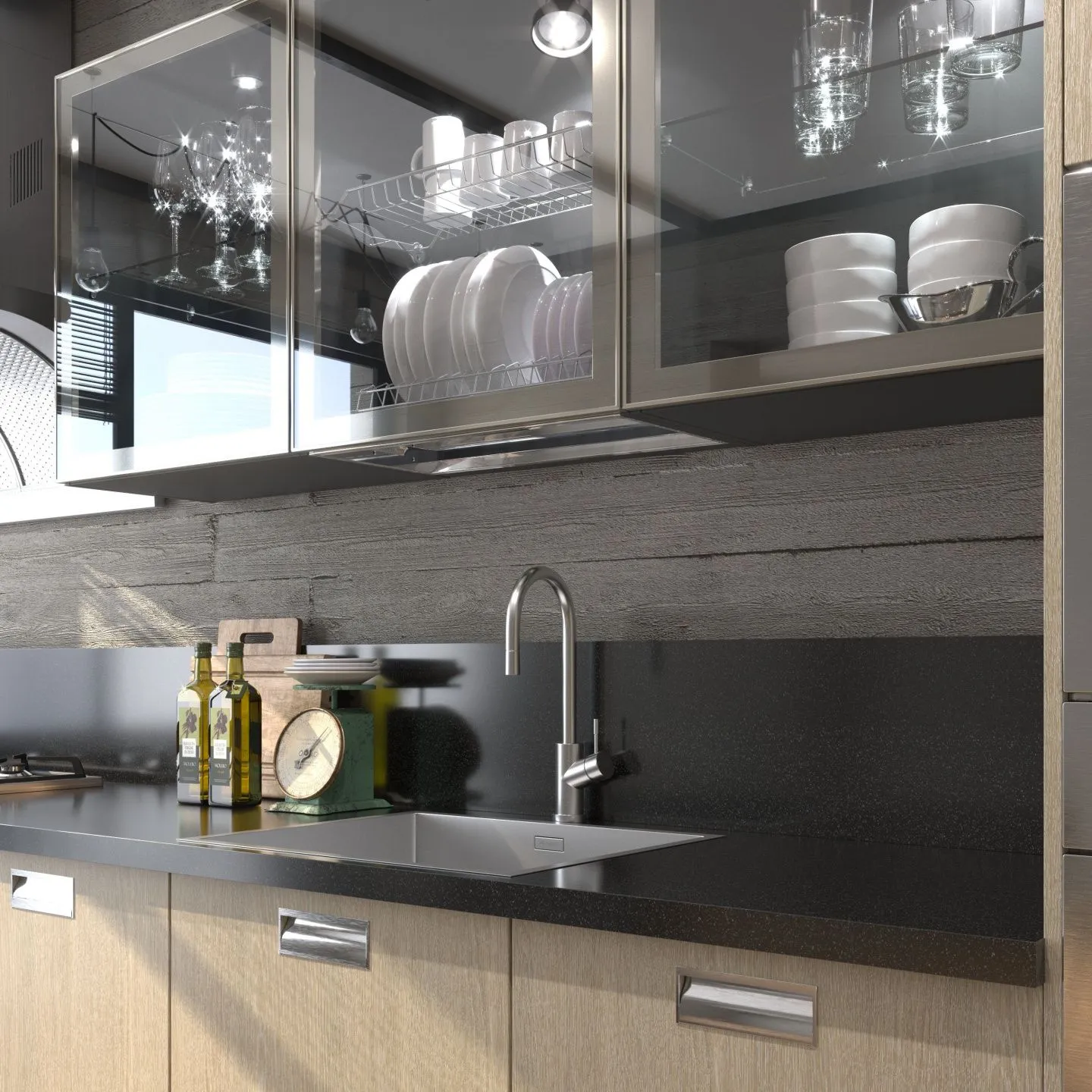 Прямая кухня в бежевых цветах. Навесные шкафы оборудованы подсветкой и имеют прозрачные дверцы, что создает уютную атмосферу и делает внешний вид кухни более домашним. Вся бытовая техника встроенная, кухня удобная и функциональная. Гарнитур отлично впишется в интерьер в стиле «Лофт».