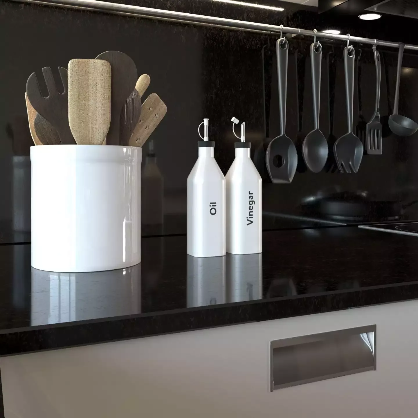 Столешница, импровизированная барная стойка и стеновая панель выполнены из искусственного камня «Quarzelan» в декоре «Неро лусидато».