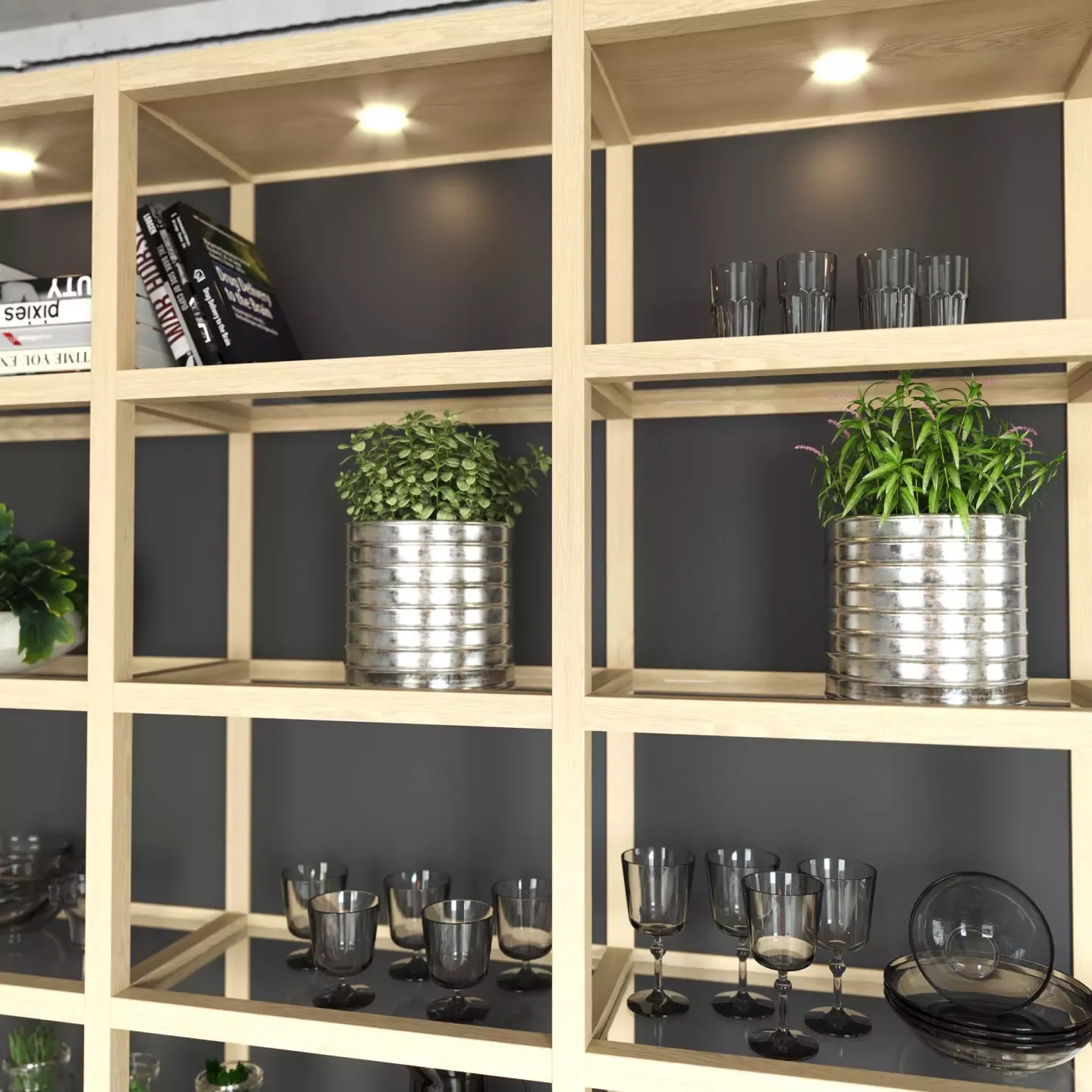 В основе стеллажной конструкции брусок «Теларо» (прочные деревянные рейки, облицованные шпоном) в декоре «Дуб светлый».