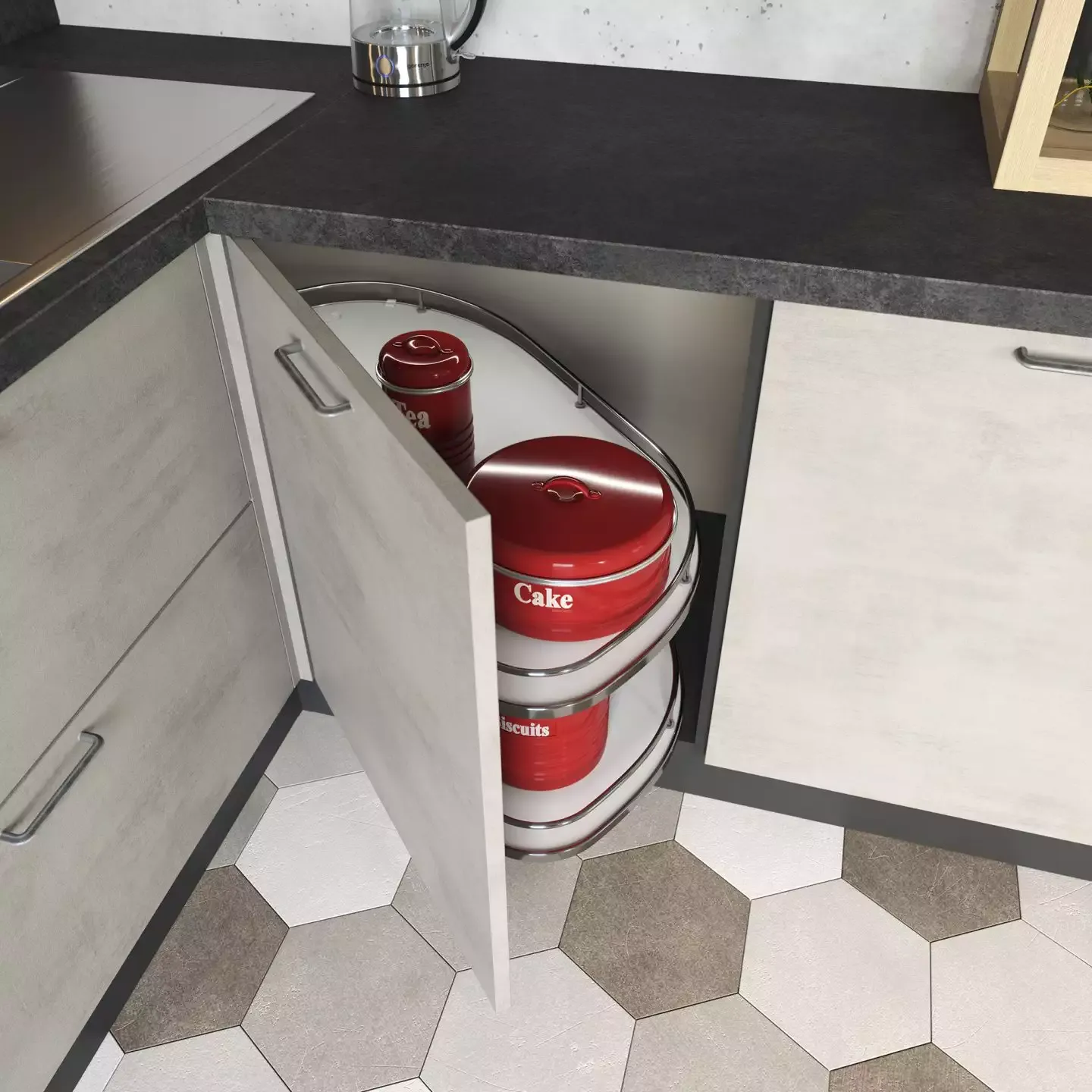 Корпус выполнен из ламинированной плиты в декоре «Графит», фасады «под бетон» - декор «Хромикс Серебро».