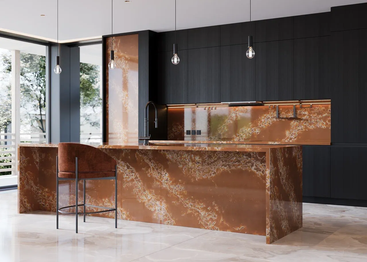Декор EQ027P Ambra воссоздает неповторимый рисунок, придавая вашей кухне благородство и изысканность. Столешница станет центральным элементом как классической, так и современной кухни, идеально подойдет для кухонного острова.