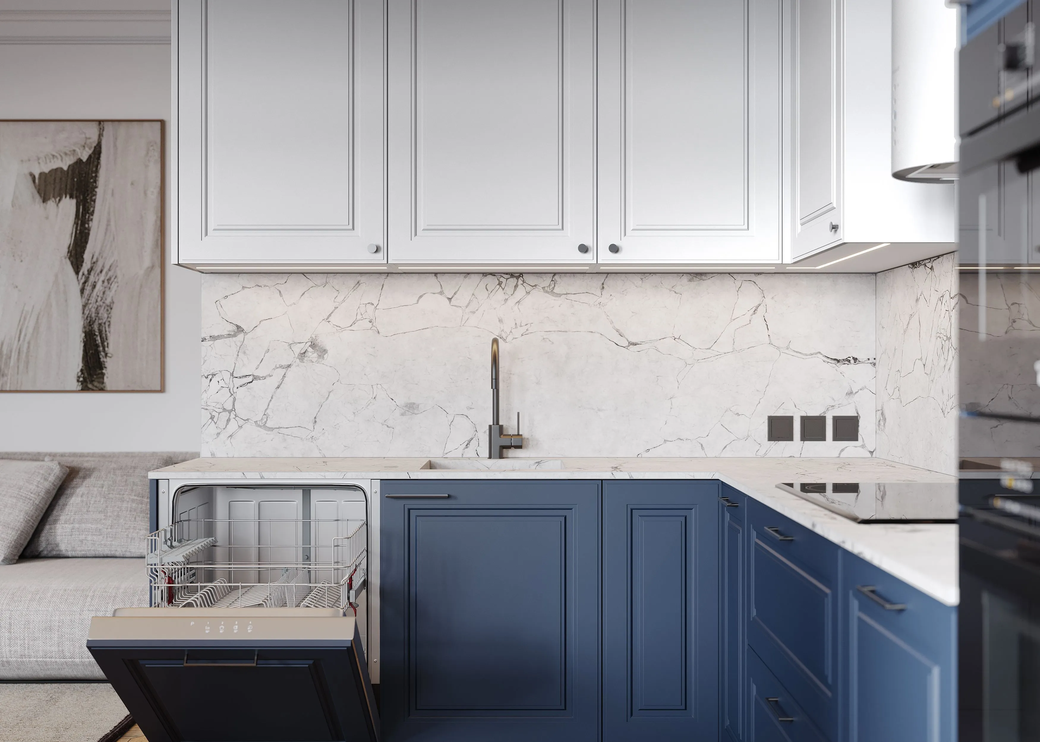 Кухня в неоклассическом стиле с закрытыми шкафами, выполненная в сочетании двух цветов, станет прекрасным украшением любого дома, коттеджа или квартиры. Благодаря своим элегантным линиям она подойдет и для просторных помещений, и для небольших квартир-студий. При этом высокие, достигающие потолков шкафы создадут ощущение простора и легкости. Они удобны в сборке, а скрытые крепежи не нарушают эстетический внешний вид модели. Шкафы такого типа нетребовательны в уходе, поэтому избавят вас от лишних хлопот, связанных с уборкой помещения.
