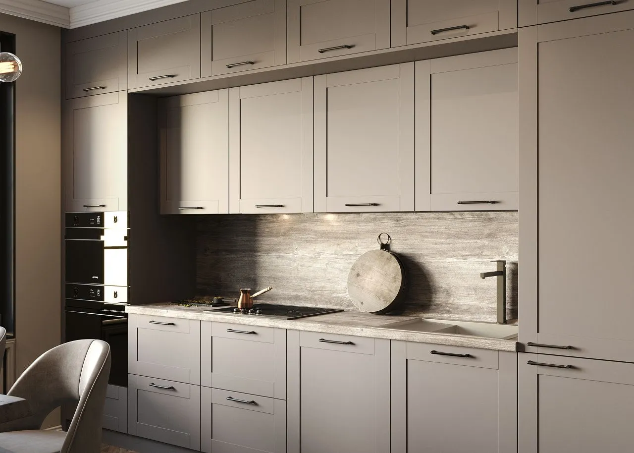 Современная прямая кухня в бежевых тонах будет уместна в интерьере, выполненном как в современном, так и традиционном стиле. Строгий рисунок фасадов с рамками и ручками-скобами, насыщенный теплый свет и продуманный дизайн позволяют использовать гарнитур и в квартире-студии, и загородном доме. Эта модель будет выигрышно смотреться в помещении, оформленном в теплых тонах, и интерьере в стиле сканди, лофт или мидсенчури.