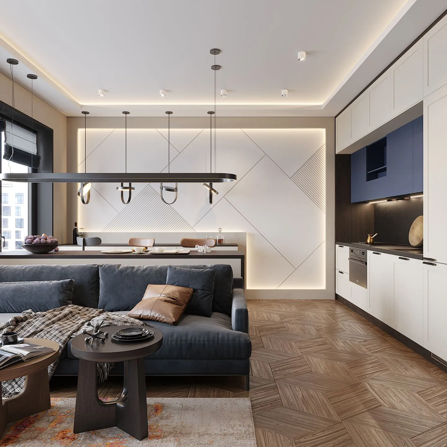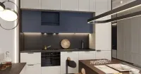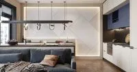 Кухня состоит из собранных в единый кластер просторных шкафов и рабочей зоны – столешницы, а также отдельно расположенных острова и подвесной консоли.