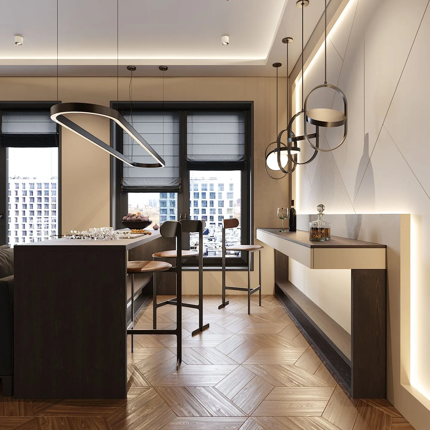 • остров и консоль напротив острова – ЛДСП в декорах “Гейнсборо” и “Дуб Термо”.
