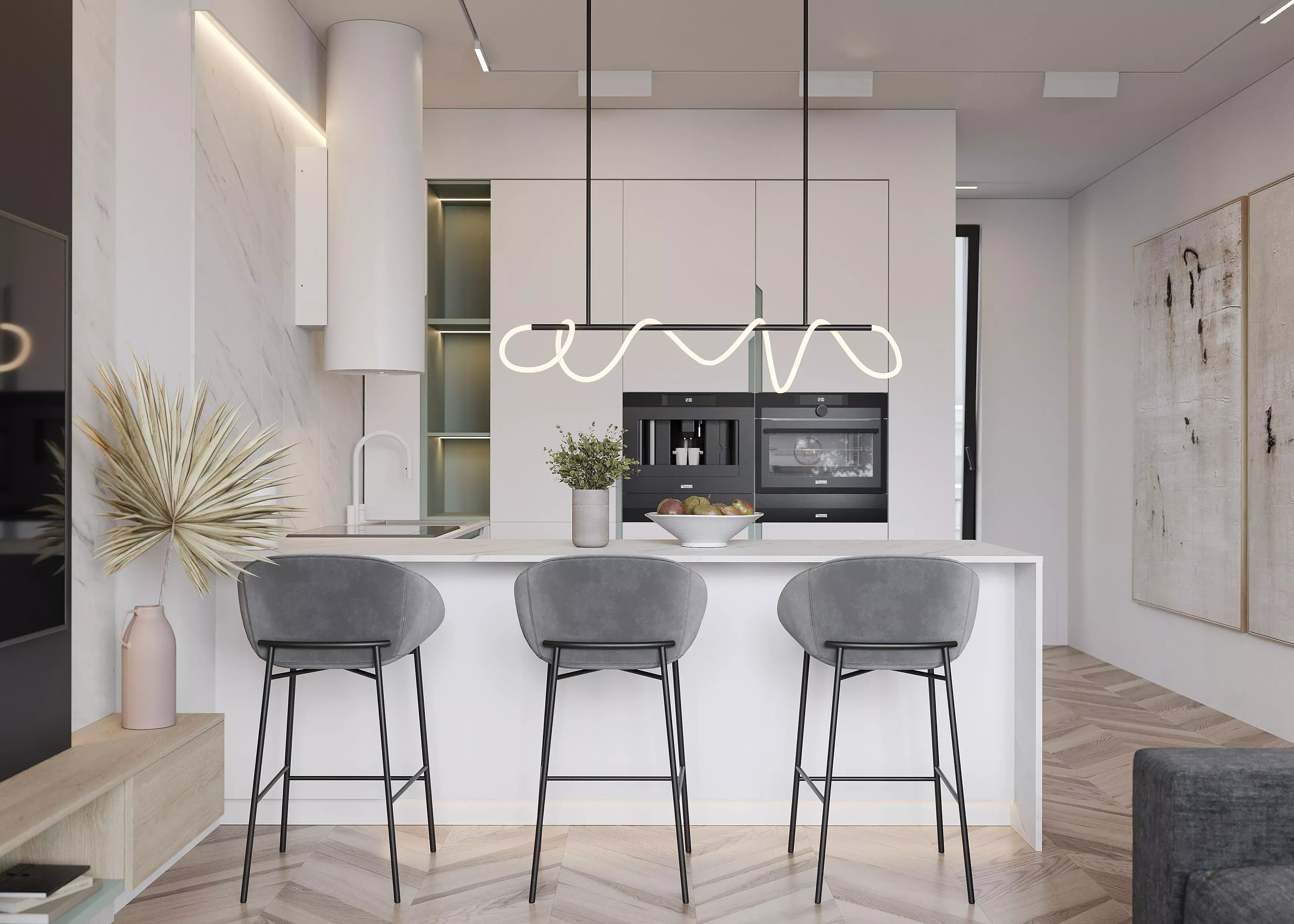 Изделие выполнено из прочной ЛДСП в цвете «Алебастр». Фасады изготовлены из ДСП и покрыты матовым покрытием этого же оттенка с незначительными акцентами цвета «Шалфей». Спокойная светлая расцветка подойдет и для современного стиля, и для минимализма, и для сканди. Все элементы изготавливаются по индивидуальным размерам после расчета проекта и обсуждения с заказчиком.