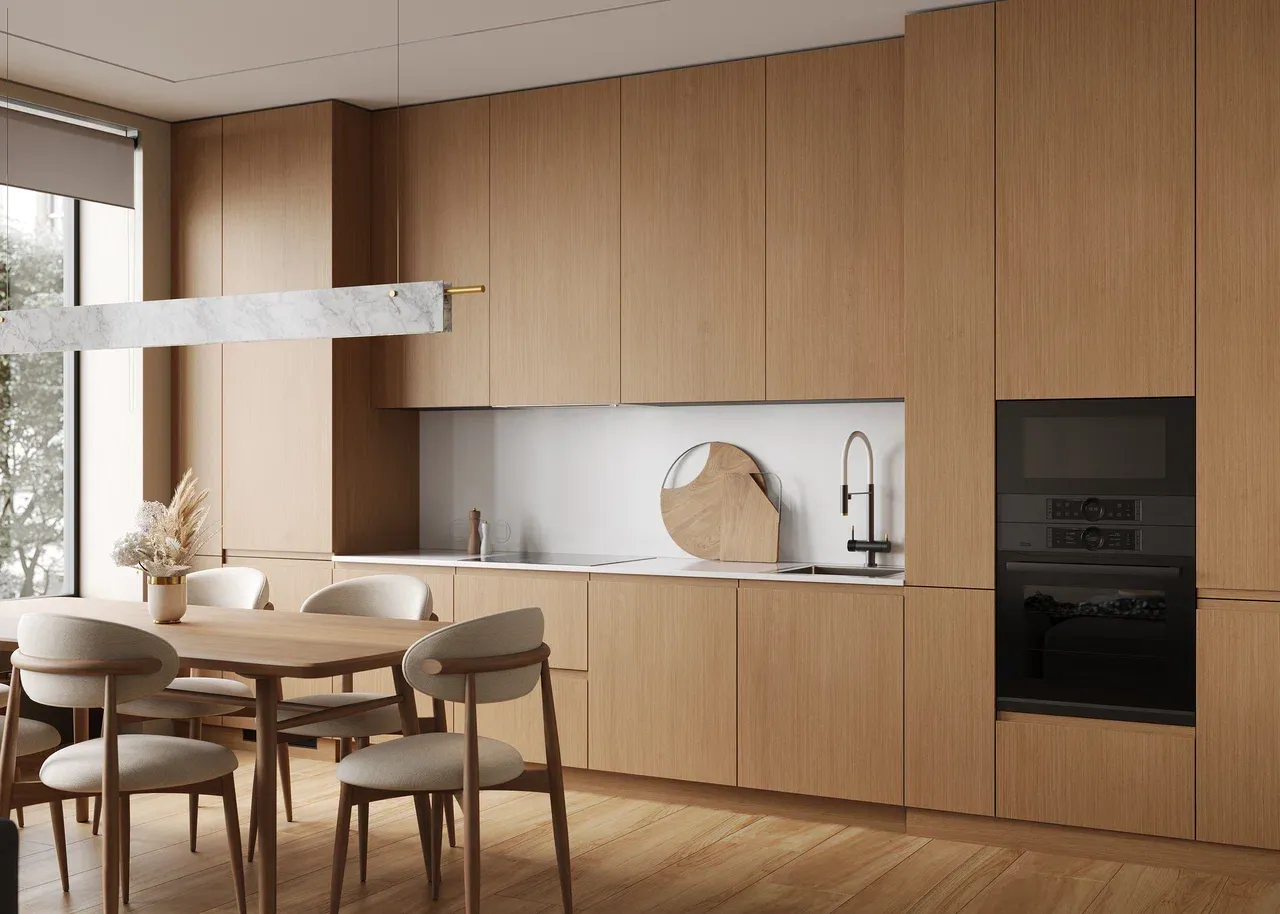 Прямые кухни в стиле модерн отличаются минималистичным дизайном, что делает их визуально легкими и ненавязчивыми, идеально подходящими для современных интерьеров.