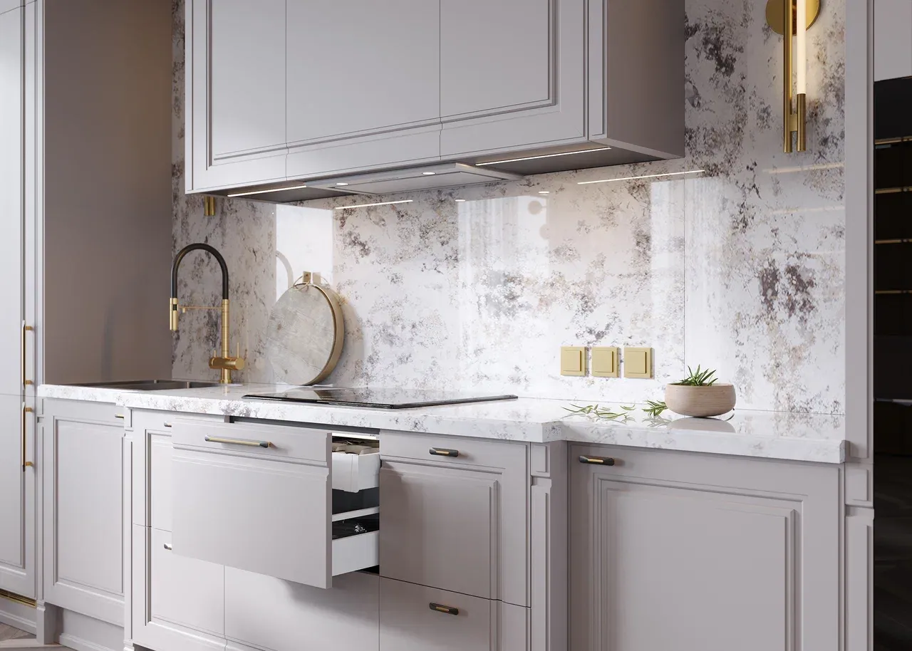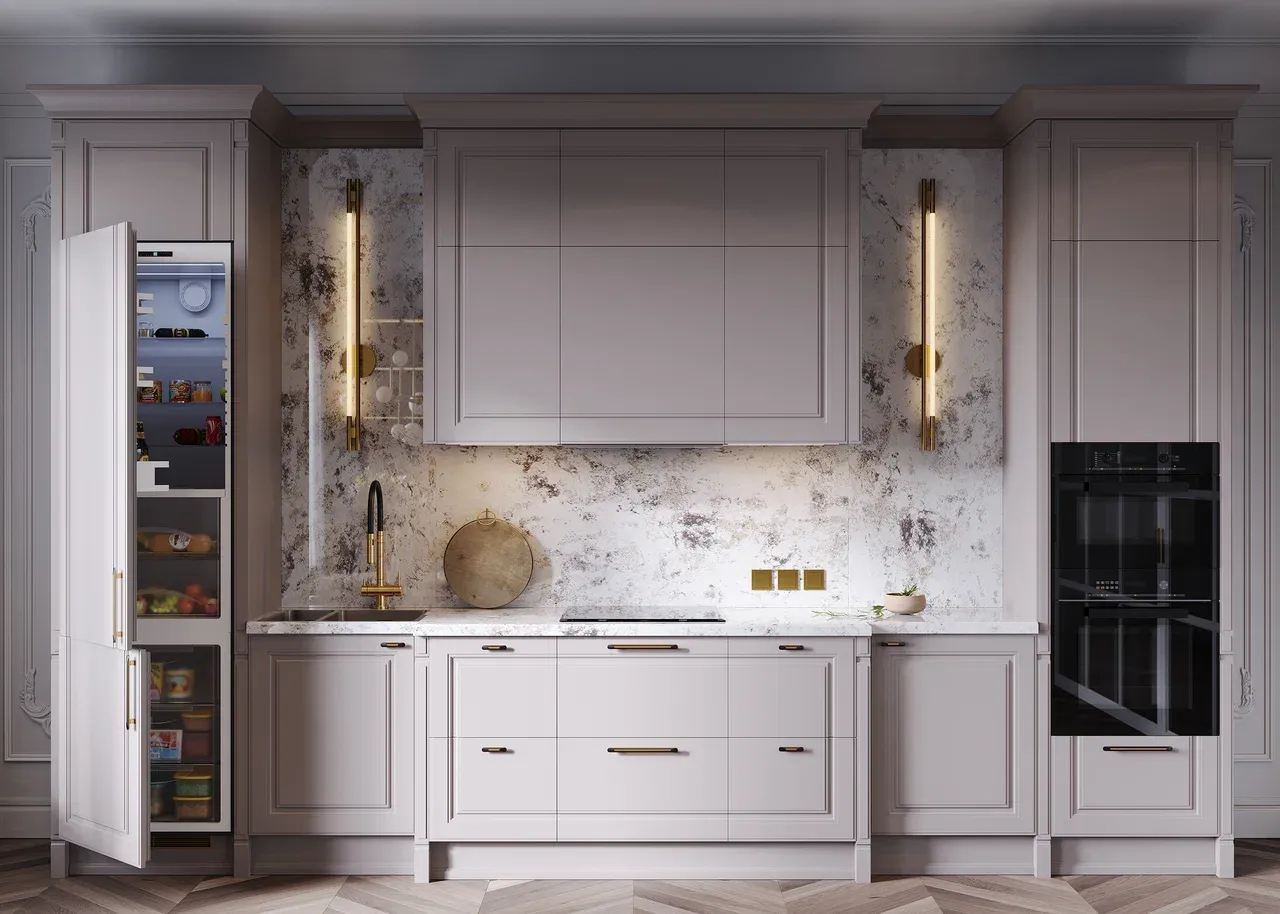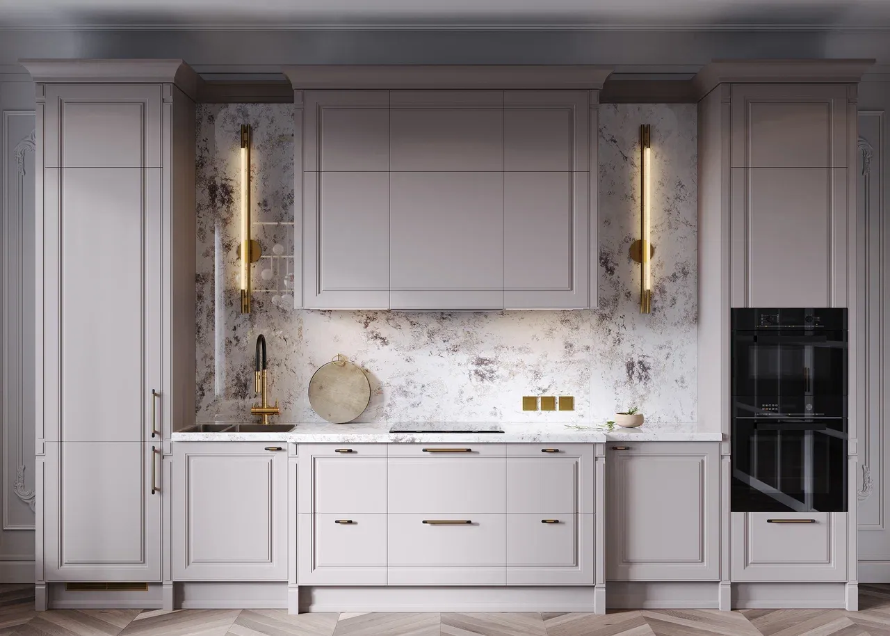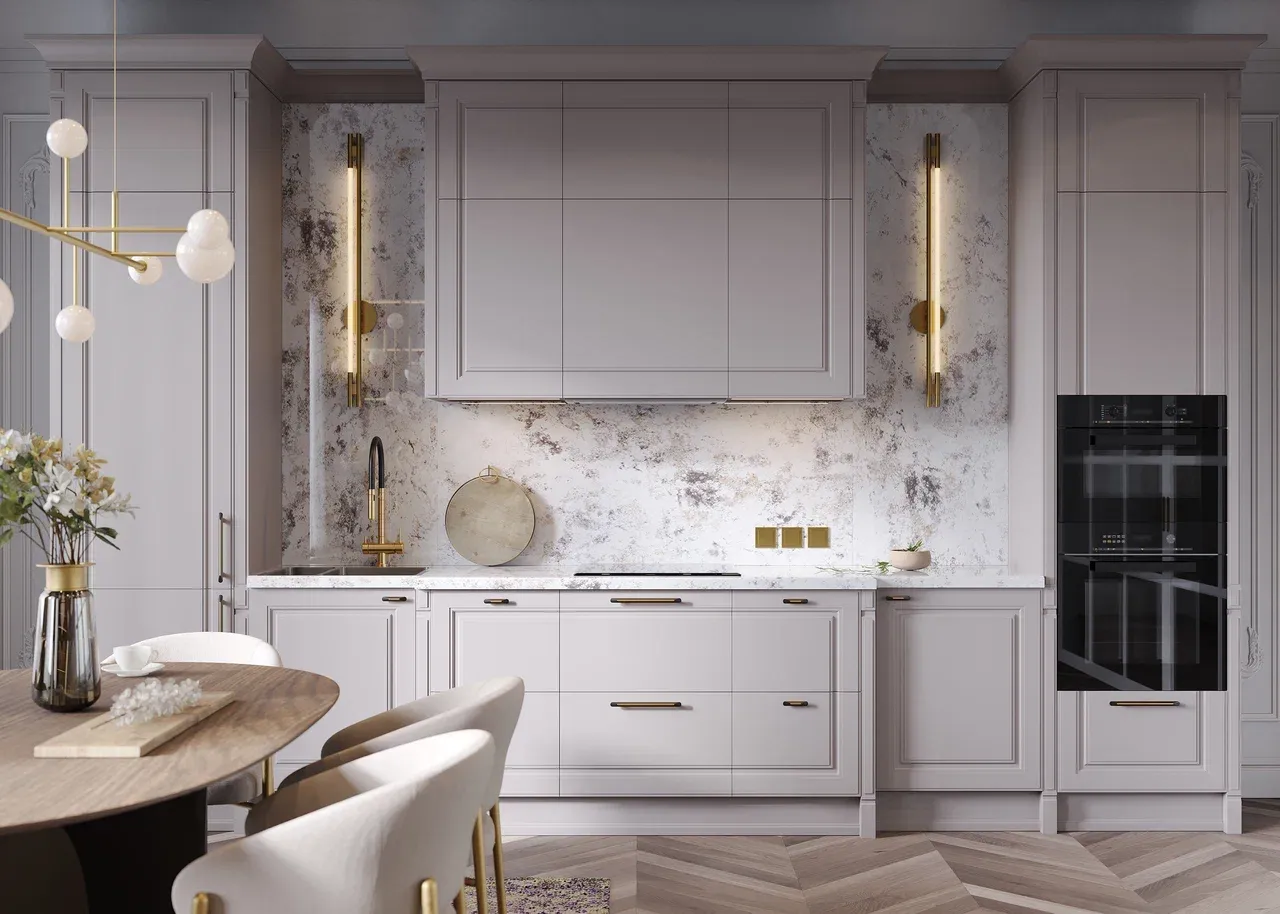 Использование пастельных оттенков и натуральных материалов придает кухне солидность и презентабельность. Неоклассика универсальна и легко адаптируется под любые изменения, сохраняя при этом свою элегантность.