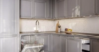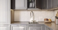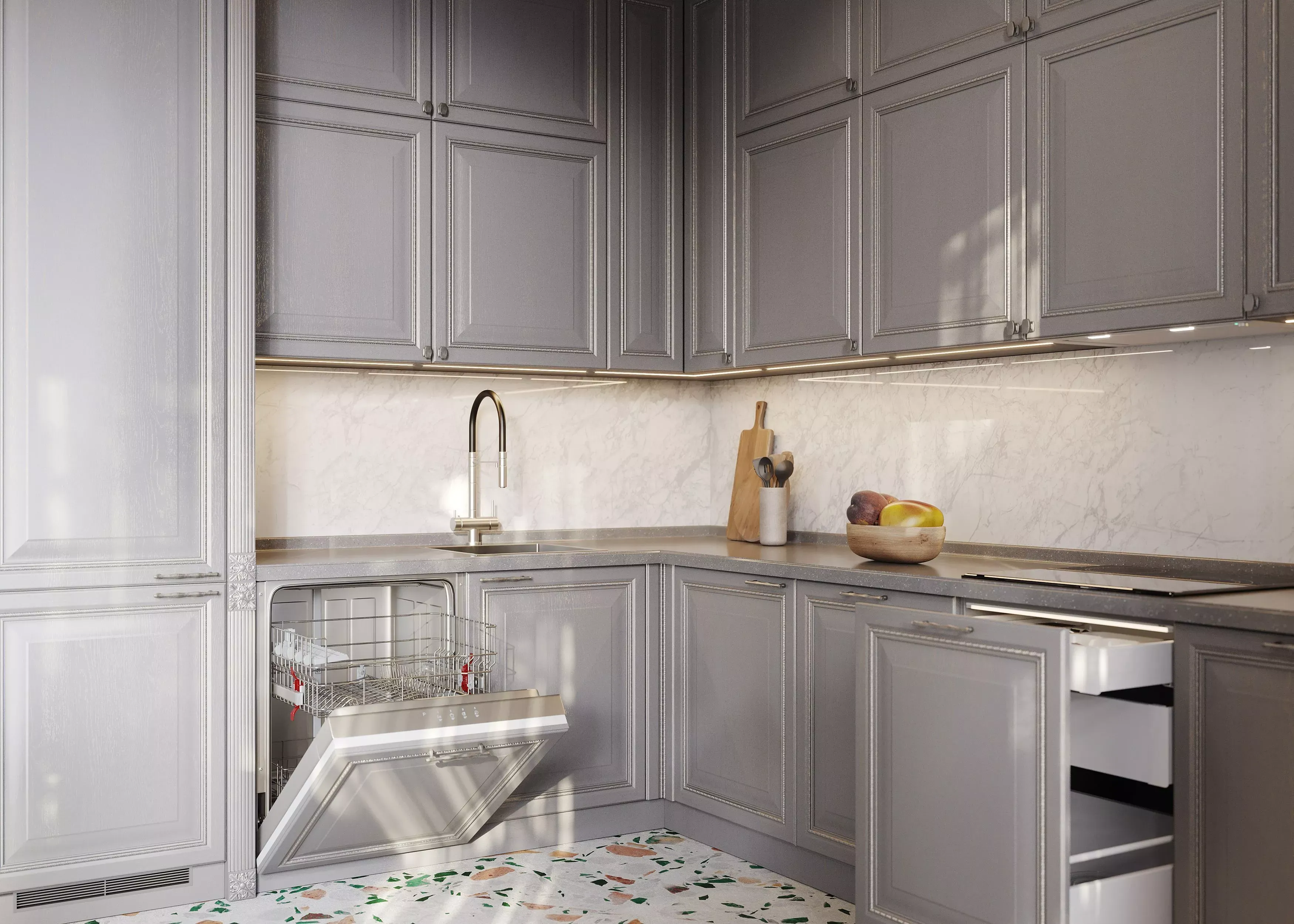 Кухня Lorenzo (арт. 311) выполнена в сером декоре с патиной – серебро. Кухня включает в себя ряд элементов, необходимых для создания комфортной и функциональной зоны для приготовления еды и уютных семейных посиделок: открытые и закрытые шкафы и полки, мойка совмещенная с рабочей поверхностью из искусственного камня, встроенная бытовая техника – плит, духовой шкаф, микроволновая печь и холодильник. Они полностью интегрируются в дизайн кухни.