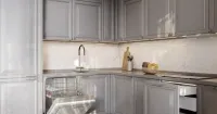 Корпус изготовлен из долговечного ЛДСП в цвете MK Муссон. Фасады из МДФ в пленке с патиной “Лоренцо Лунный” с серебряной патиной создают уникальный и изысканный вид вашей кухни.