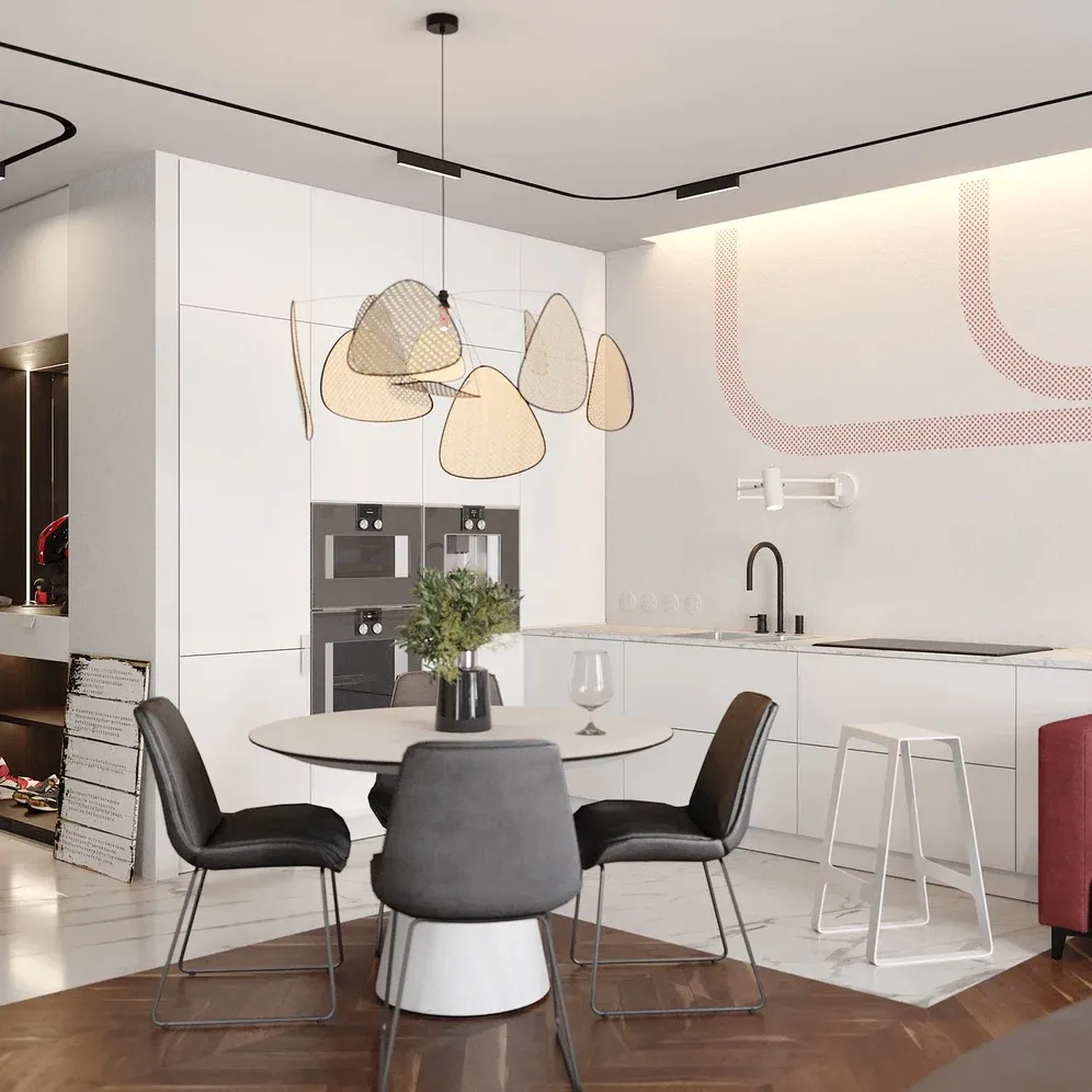 Проект угловой белой кухни в стиле «Модерн». Кухня является частью большого помещения, объединяющего функции гостиной и столовой. Рабочая зона небольшая, вся техника встроена в нишу, в которой также располагаются шкафы для хранения посуды и продуктов. Кухня идеально вписана в помещение, она очень светлая и удобная.
