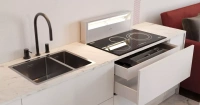 Этот проект отлично подойдет для современной молодой семьи. Он отлично впишется в квартиру-студию или апартаменты. Несмотря на то, что кухня занимает совсем немного места, на ней будет удобно готовить.