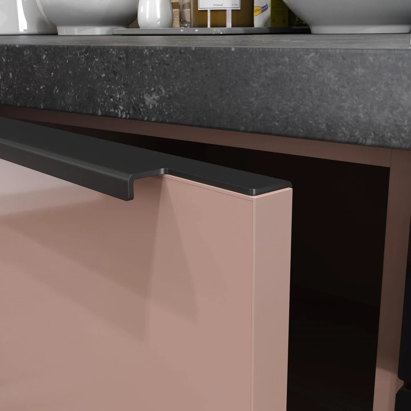 Столешница сделана из ламината HPL Price Minus в декоре “Гранит Верчелли Антрацит”. Открытые полки произведены из алюминиевых стоек Кадро в декоре “Черный”.
