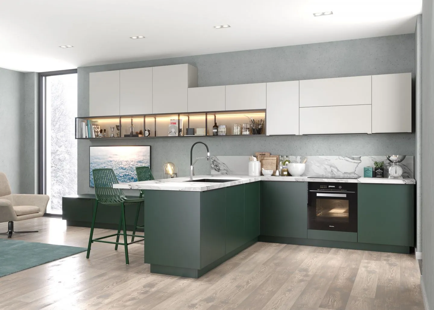 Корпус из ЛДСП в декорах “Гейнсборо” и “Яшма”. Для фасадов верхнего яруса используется МДФ в лаке (серия “Витра”) в декоре “Телегрей” (матовый). Для фасадов нижнего яруса — ЛДСП в декоре “Яшма”. Столешница выполнена из ламината HPL Price Minus в декоре “Мрамор Каррара Белый”. Открытые полки сделаны из алюминиевых стоек Кадро в декоре “Черный”.