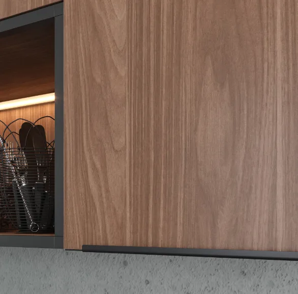 Открытые полки, выполненные из алюминия, на которых можно будет разместить обеденную посуду и аксессуары для готовки.