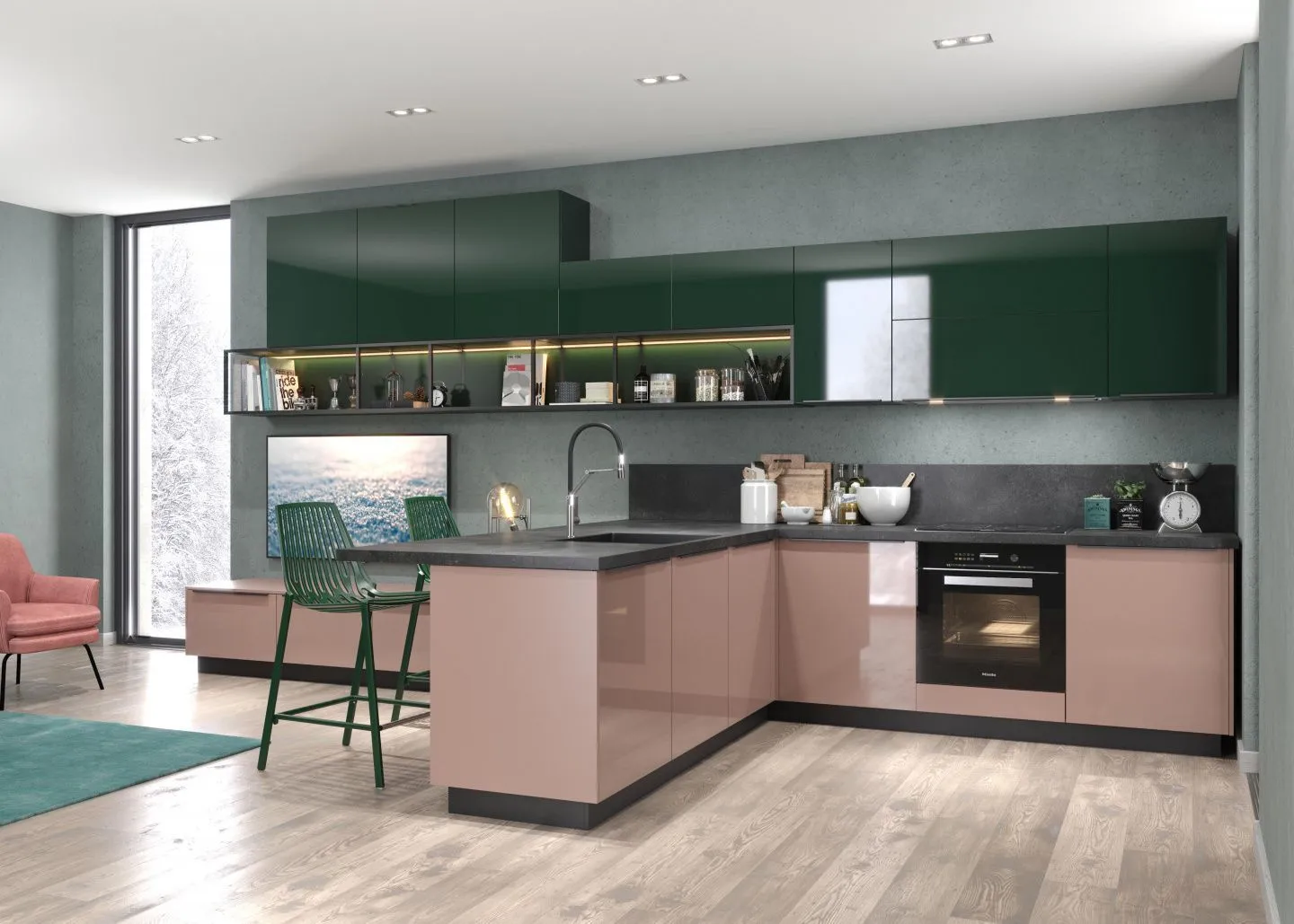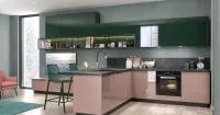 Кухня в зеленых, розовых и коричневых тонах — элегантная и стильная модель для современной квартиры. Вы можете заказать представленную композицию в одном из трех вариантов, подходящем исключительно для вашего дома. Наши дизайнеры с удовольствием помогут с подбором оптимального сочетания оттенков и материалов.