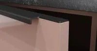 Корпус из ЛДСП в декорах “Яшма” и “Лотос”. Цоколь кухни представлен в оттенке “Графит”. Верхние и нижние фасады сделаны из МДФ в лаке (серия “Витра”) и оформлены в декорах “Яшма” и “Лотос”. Столешница произведена из ламината HPL Price Minus в декоре “Гранит Верчелли Антрацит”. Материал открытых полок — алюминиевые стойки Кадро в декоре “Черный”.