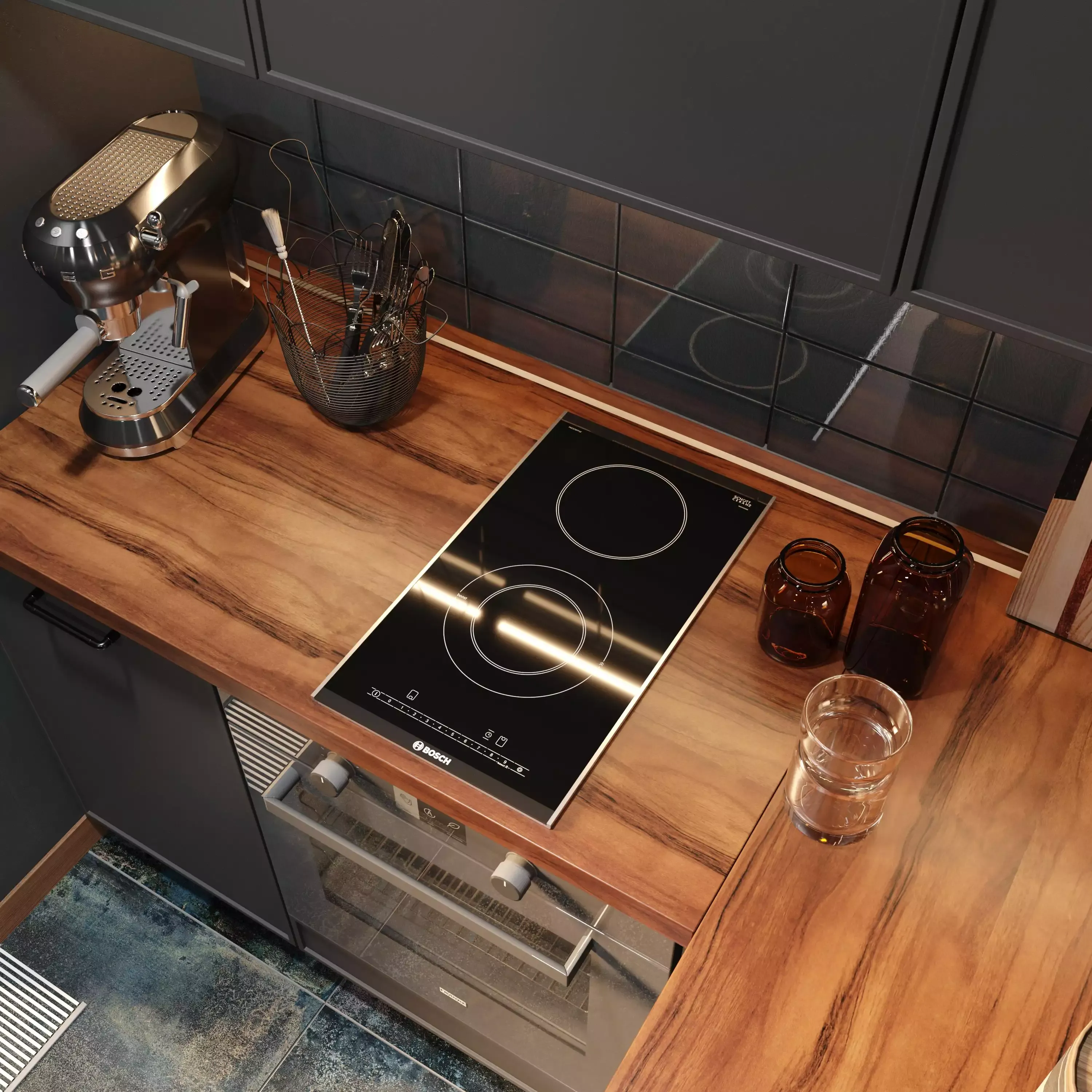 Проект небольшой угловой кухни для заказчиков, предпочитающих темные тона. Вариация серых оттенков фасадов и корпусов создает ощущение вечера, а теплая подсветка добавляет уюта. Верхние ящики расположены в два ряда, верхняя их часть достает до потолка. Это позволяет использовать полезную площадь помещения по максимуму.