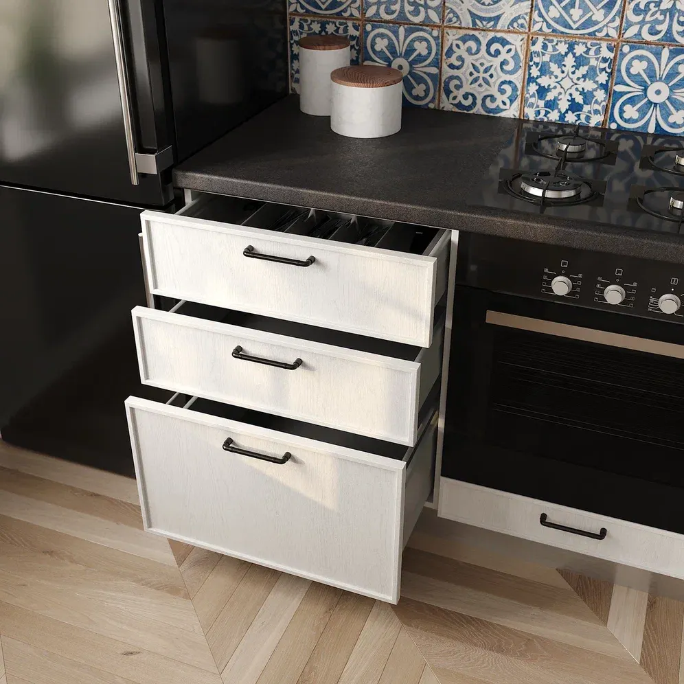 Кухня коллекция "Плаза" (арт. 192) — это красивый гарнитур с белыми матовыми фасадами и контрастной черной рабочей поверхностью. Эта мебель, выполненная из качественных материалов, прослужит вам долгие годы.