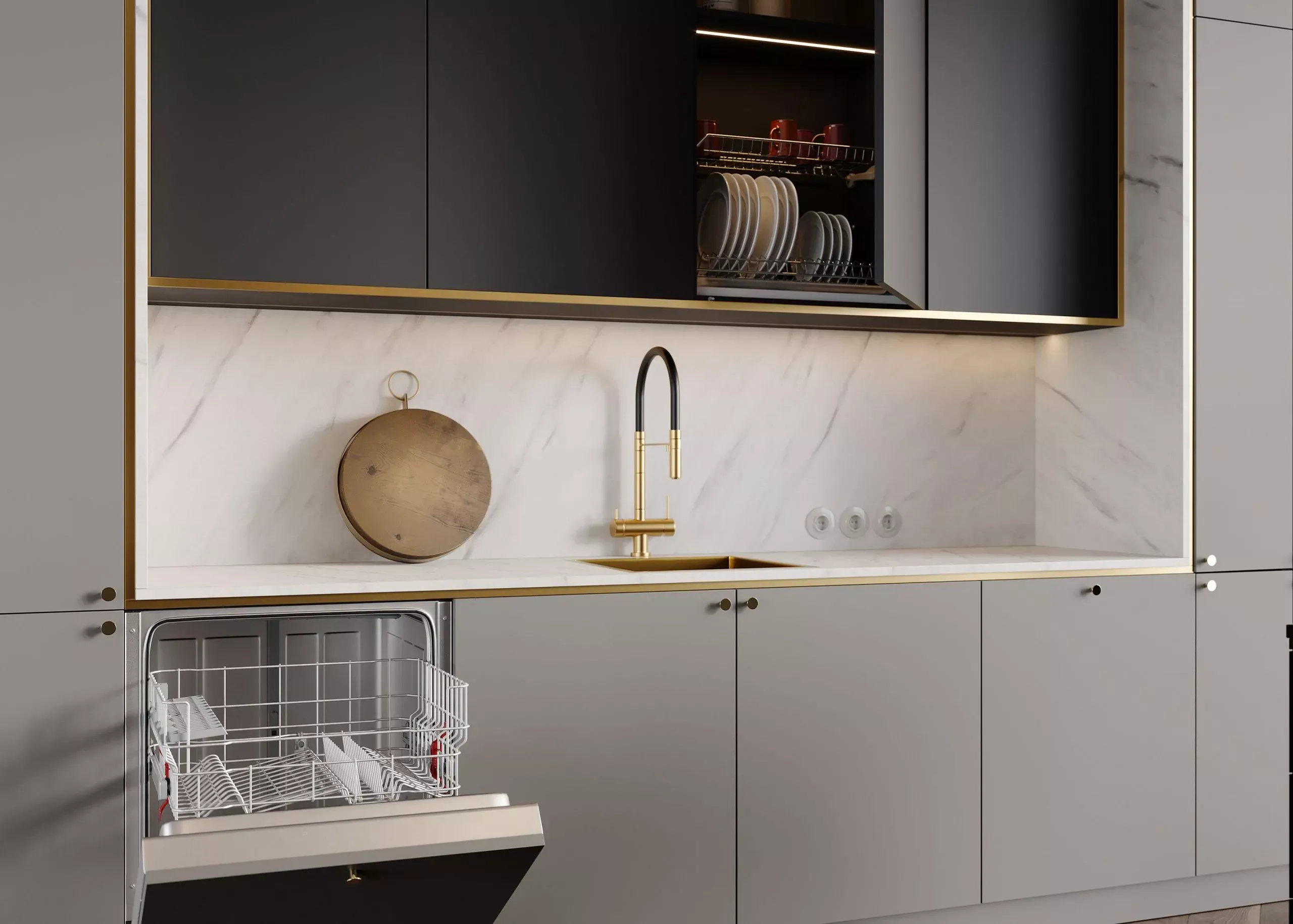 Открывание фасадов осуществляется при помощи ручки-кнопки COMO HND217 GU.