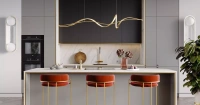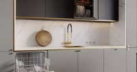 Столешница кухни выполнена из ламината TopMatt толщиной 18 мм в декоре Мрамор Леванто белый (1812). Этот материал отличается устойчивостью к царапинам и легкостью в уходе, что делает его отличным выбором для кухонного пространства. Мраморный рисунок добавляет изысканности и визуального объема в композицию.