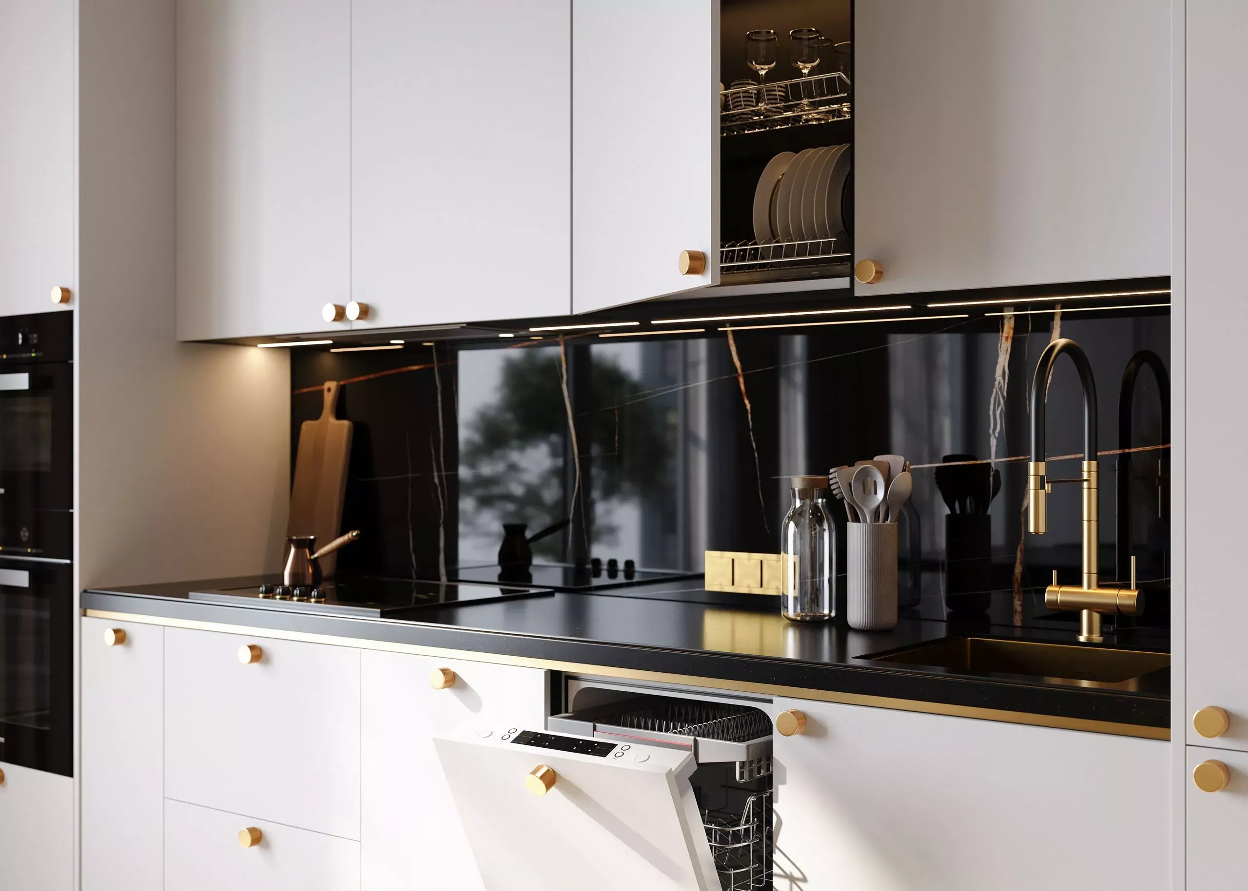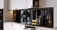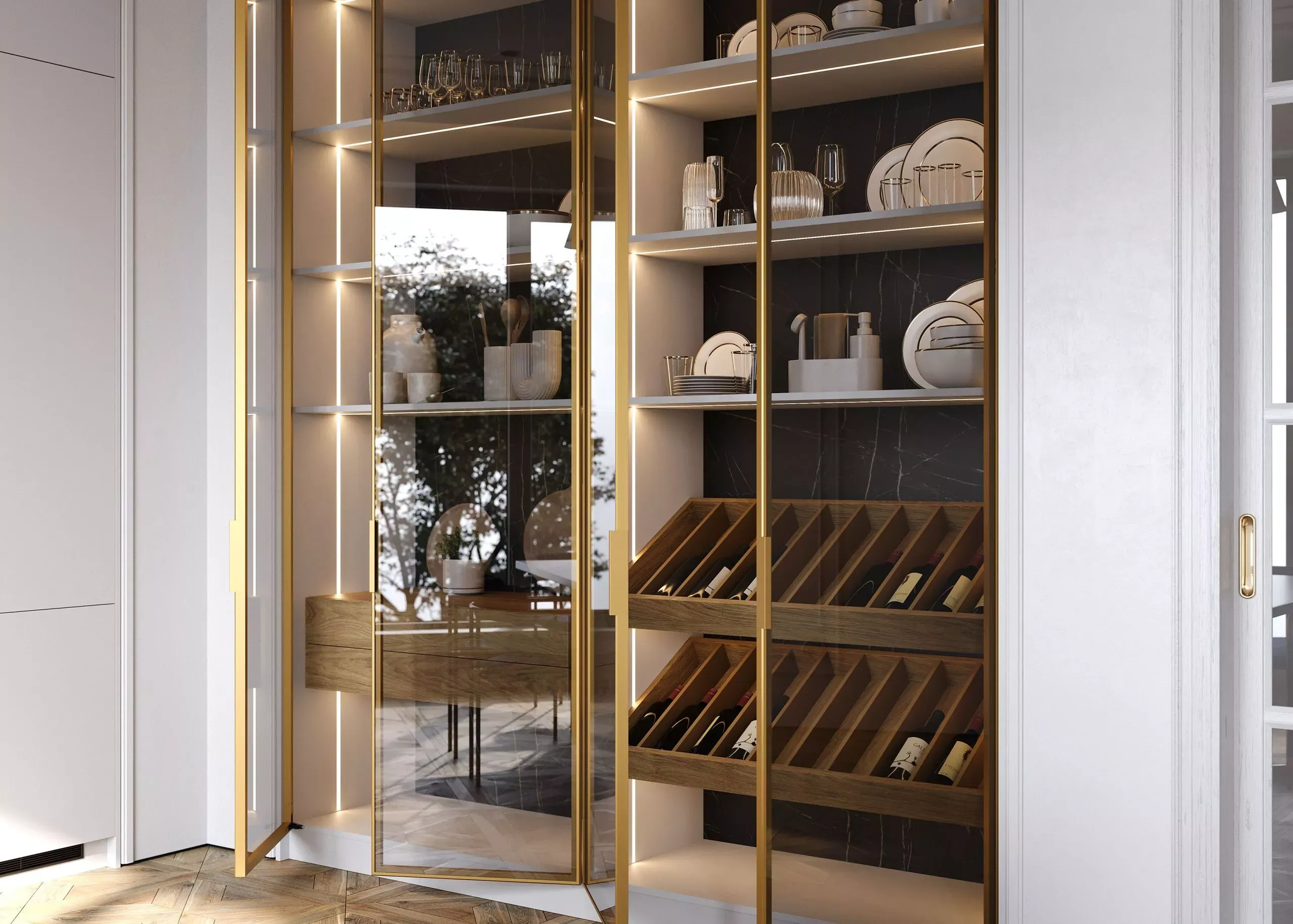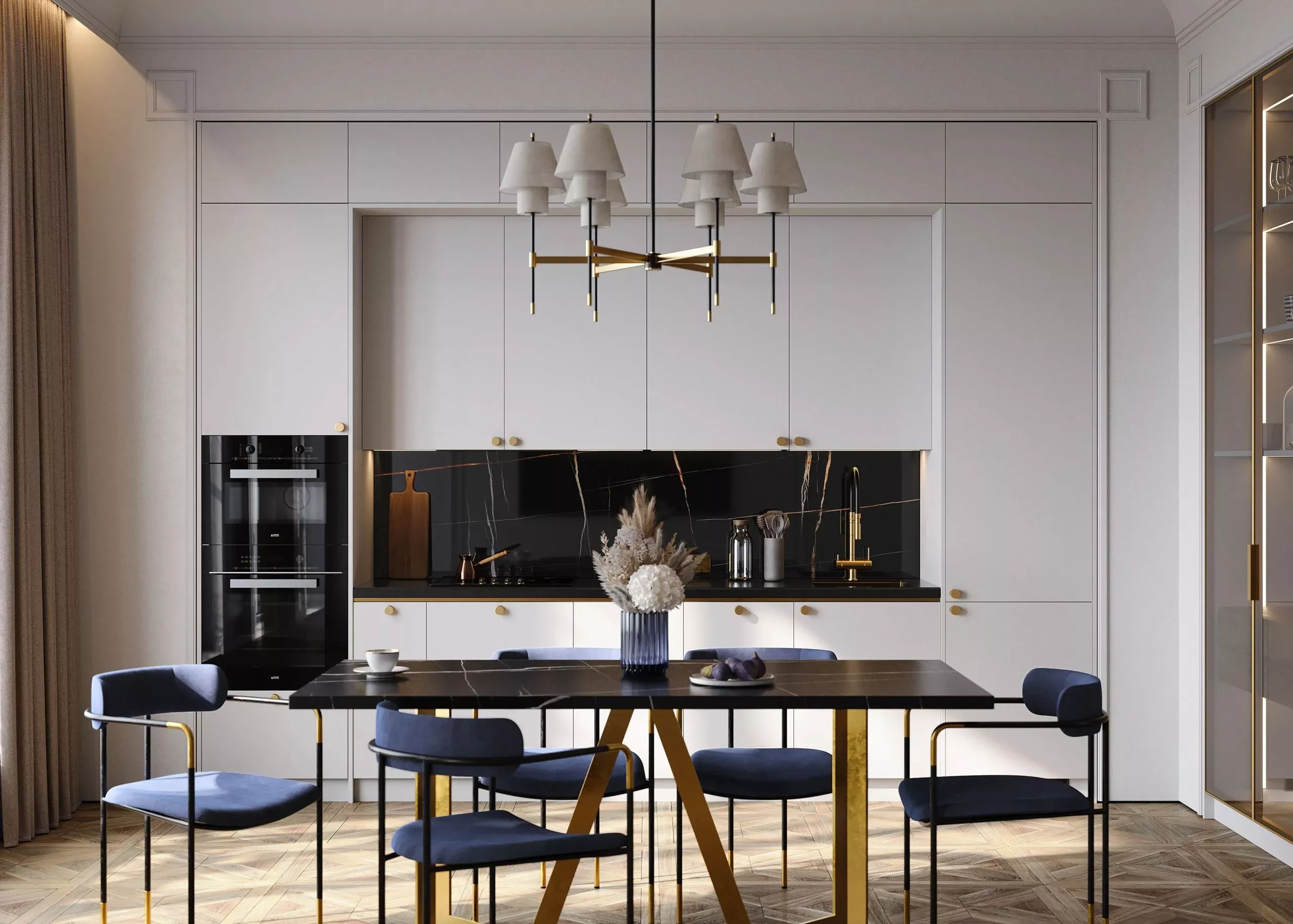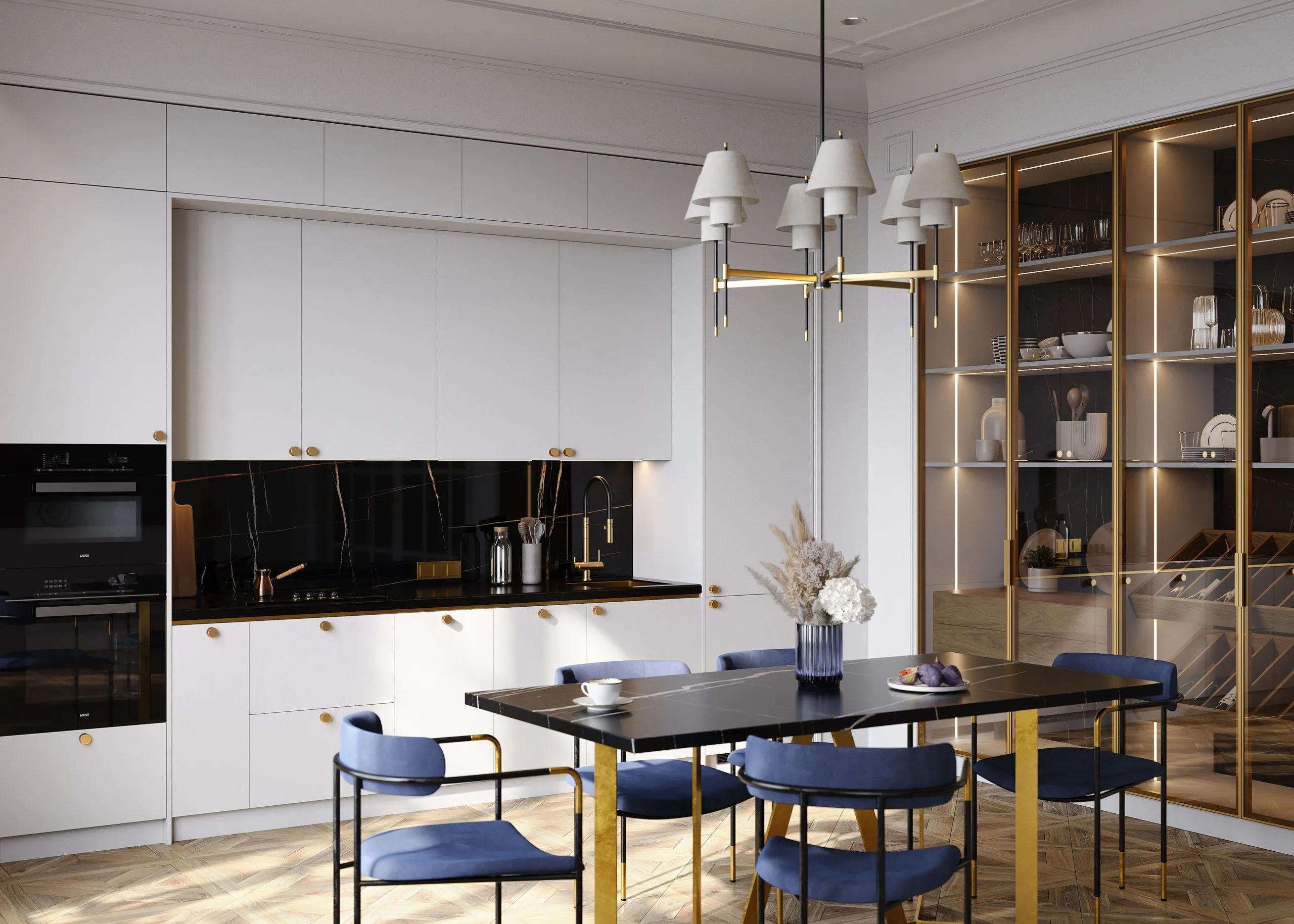 Витрины Либерта в декоре «Оро» со вставками стекла CL. Эти витрины добавляют легкости и изысканности, давая возможность дополнить кухгю декором и сделать ее дизайн еще более индивидуальным. Столешница выполнена из камня Avant Quartz в декоре A7700 Калакатта Марсель. Этот материал не только долговечен, но и привлекателен внешне благодаря своему стильному сдержанному внешнему виду.