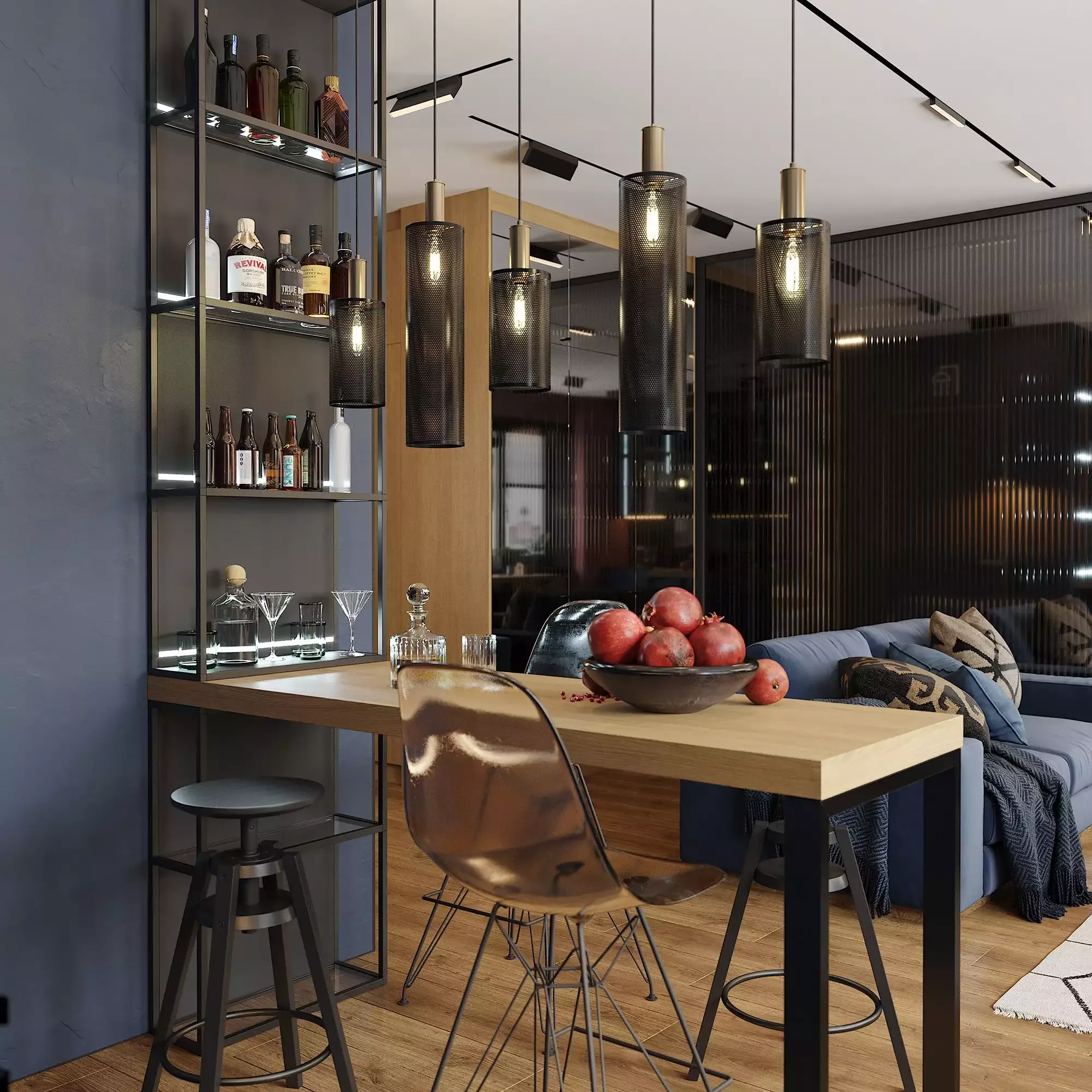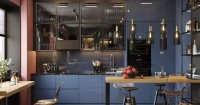 Заказать синюю кухню с барной стойкой.