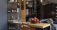 • Столешница у окна и барной стойки - панель Тамбурато 60мм толщиной в декоре “Вишня Брэнсон”. Опора “Мадрид” в черном цвете для барной стойки. Справа от стойки - стеллаж, спроектированный на основе системы металлических опор “Кадро”.