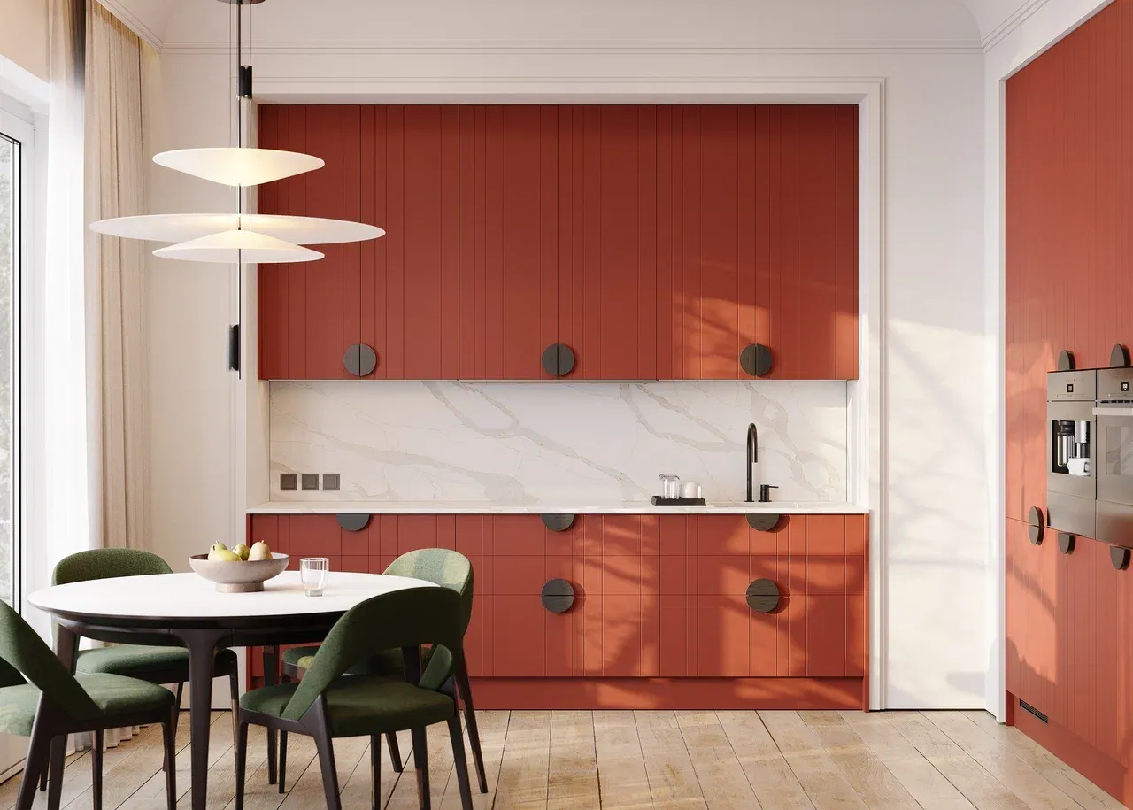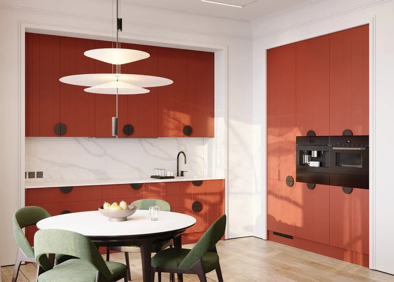 Основной материал фасадов кухни — МДФ с фрезеровкой “CODE” в матовой эмали.