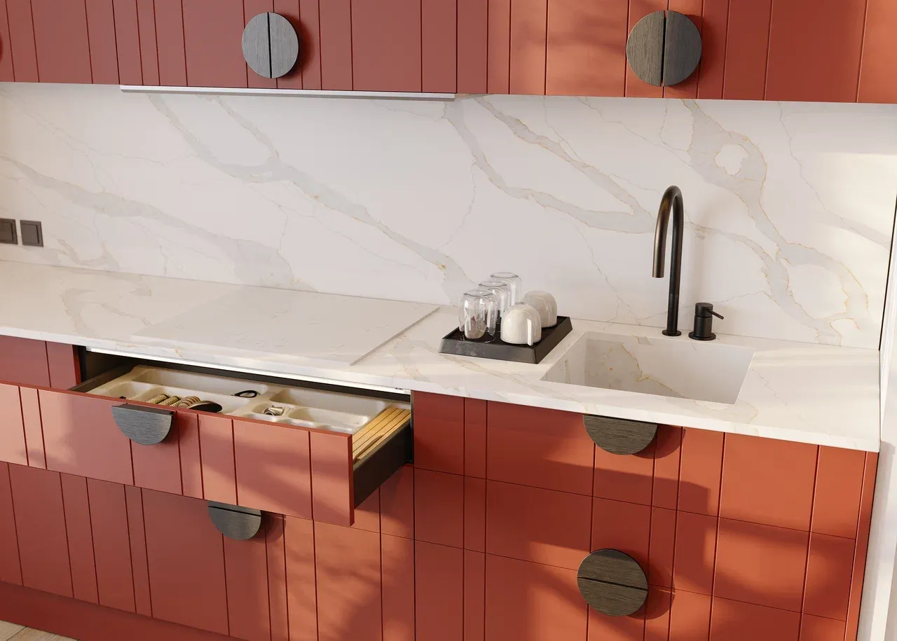 Фасады кухни оснащены удобными ручками Лес Sokotra черного цвета.