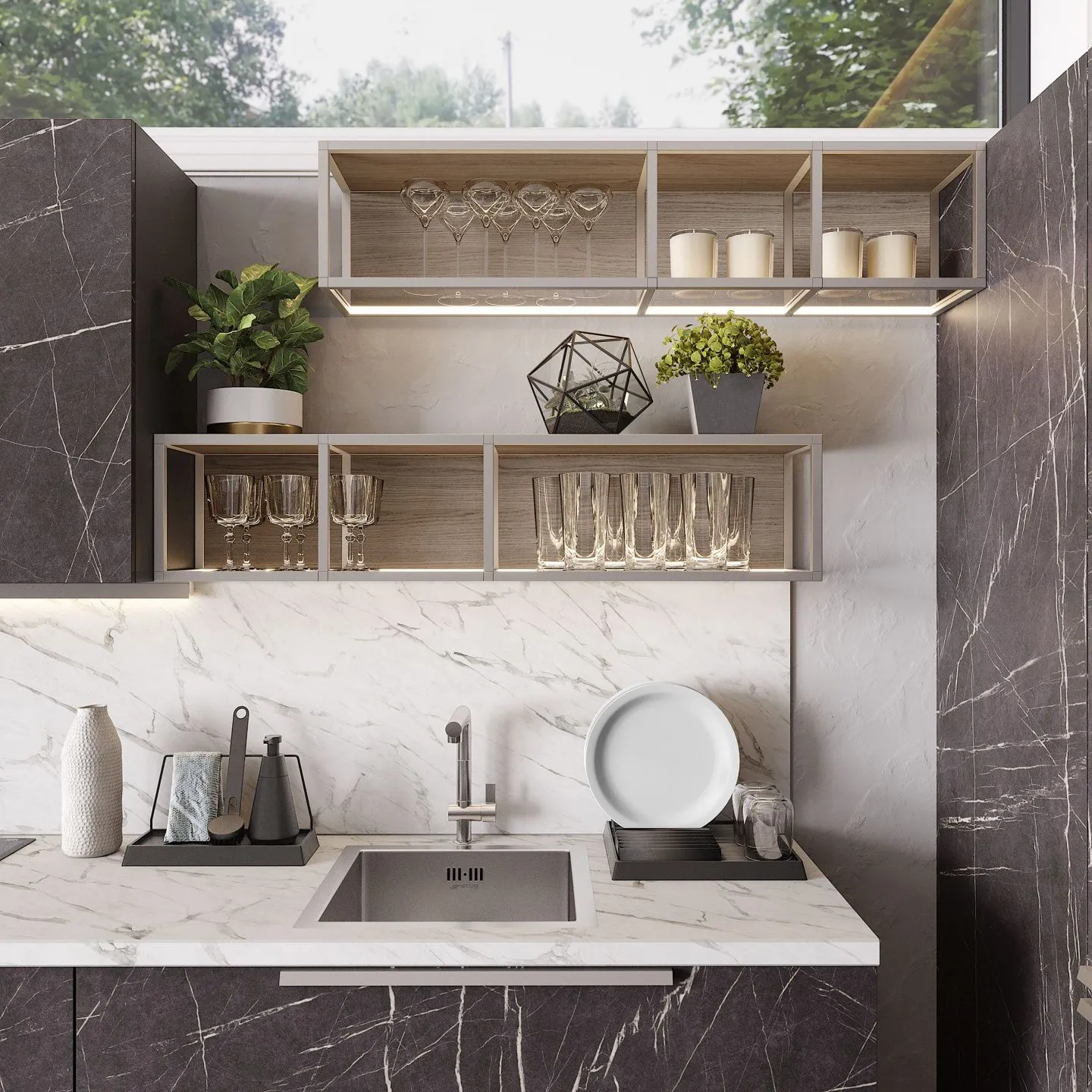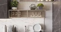 Основу композиции составляют классические тумбы и навесные шкафы. Однако последние разбавлены открытыми секциями и навесными полками, которые помогают им выглядеть менее громоздко, придают особый шик внешнему виду. Еще одна важная деталь - монолитный закрытый шкаф, в котором можно разместить встраиваемую технику на удобной высоте. Благодаря необычному декору фасадов и ручкам цвета матового серебра, гарнитур имеет оригинальный вид.