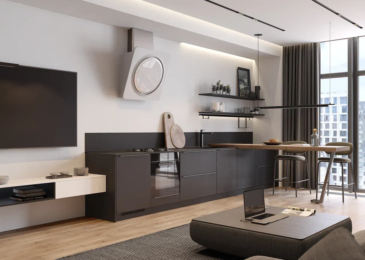 Кухня-гостиная в минималистичном стиле представляет мебель сразу для двух помещений. Комплект выполнен в контрастных оттенках: белый и черный хорошо сочетаются друг с другом и подходят для оформления любого интерьера. Сдержанный практичный дизайн делает пространство современным. Верхние базы отсутствуют, вместо них в зоне приготовления пищи располагается несколько подвесных полок.