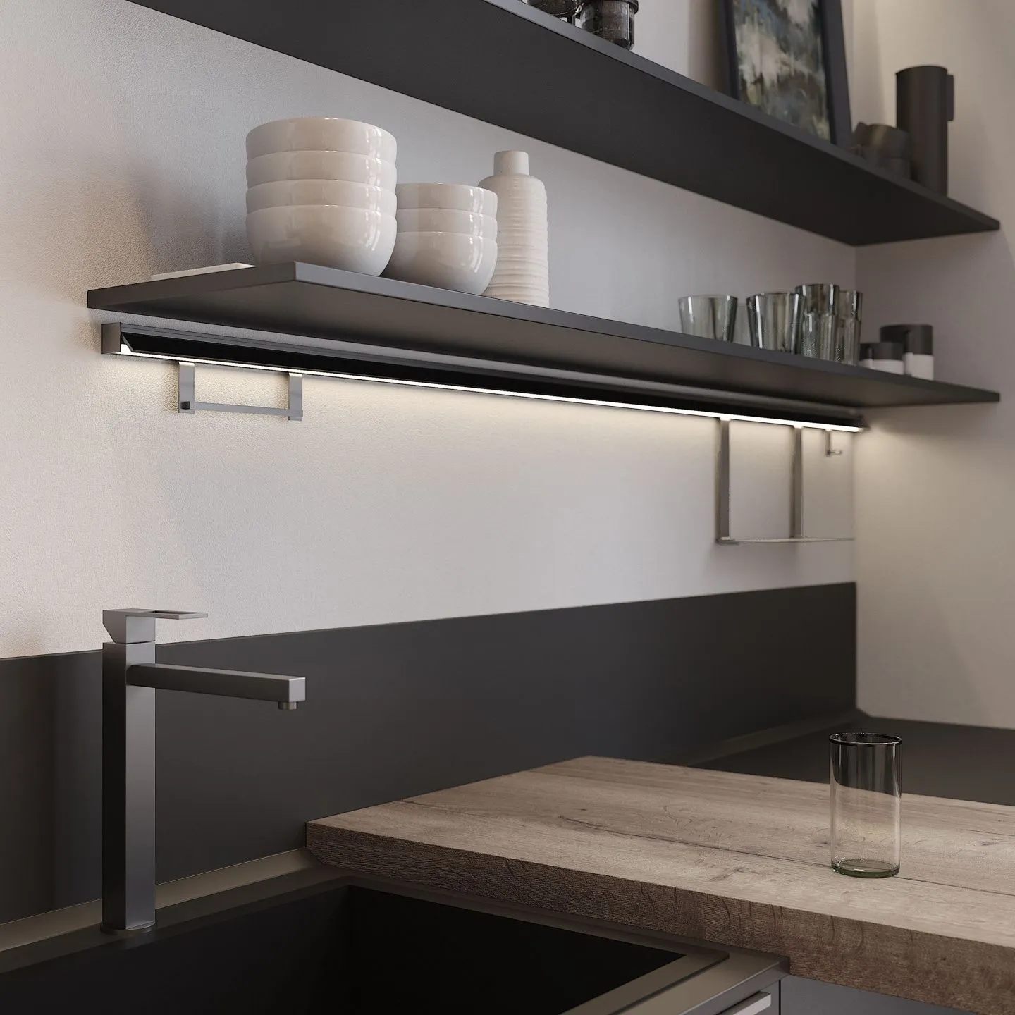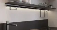 Корпус изделий выполнен из ЛДСП в декоре «Графит» и «Алебастр». Фасады и цоколь из серии Витра — это МДФ в лаке с матовой отделкой, используются декоры «Черный» и «Альпы». Столешница и фартук в зоне приготовления пищи выполнены из прочного ламината HPL, устойчивого к воздействию влаги, декор “Черный”. Дополнительная столешница толщиной 60 мм сделана из панелей Тамбуратор в декоре «Дуб Галифакс». Опора оригинальной формы — «Монреаль». Использованы светильники KOS с навесками. В жилой зоне используется вертикальная LED-подсветка Fusion.