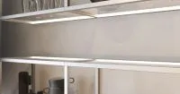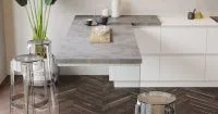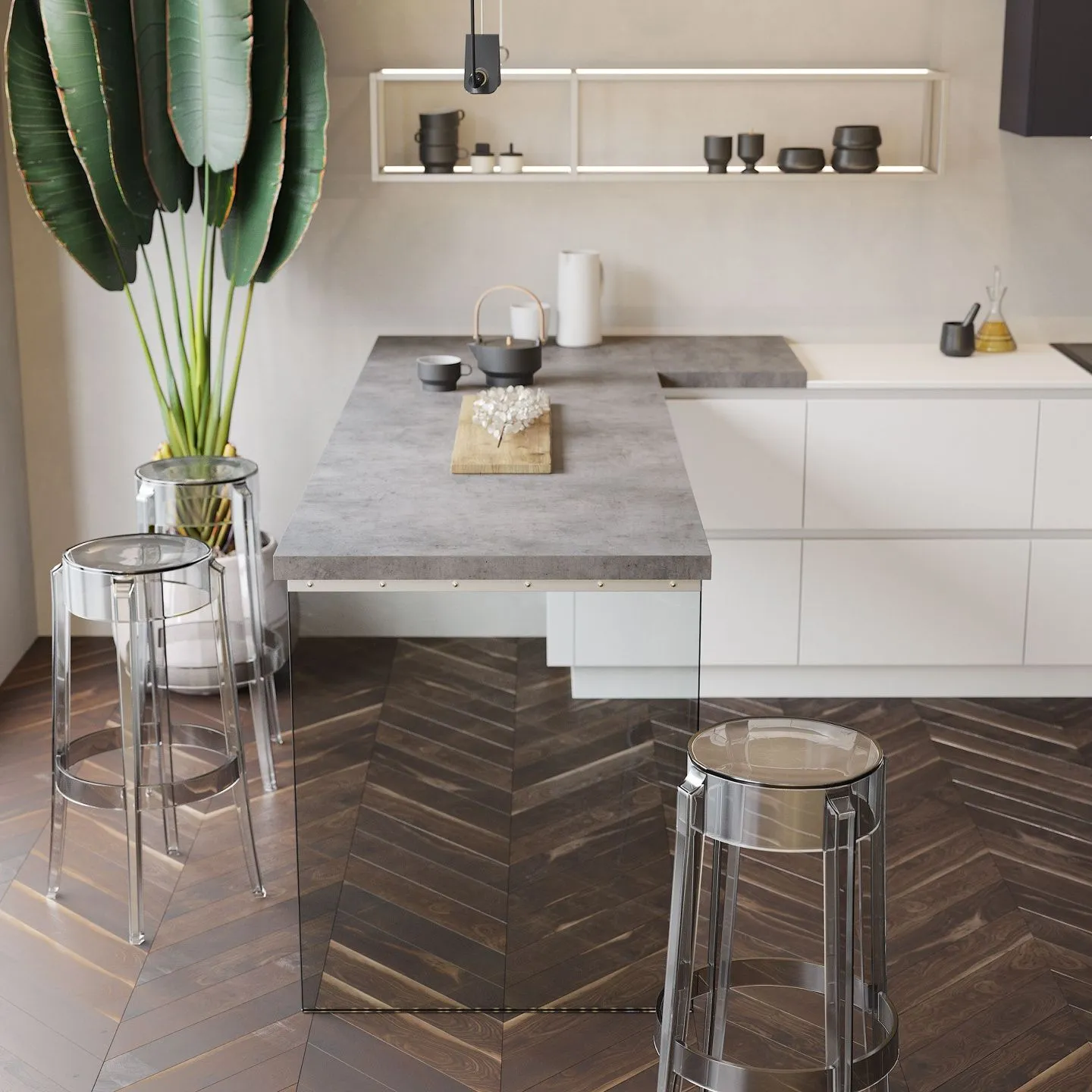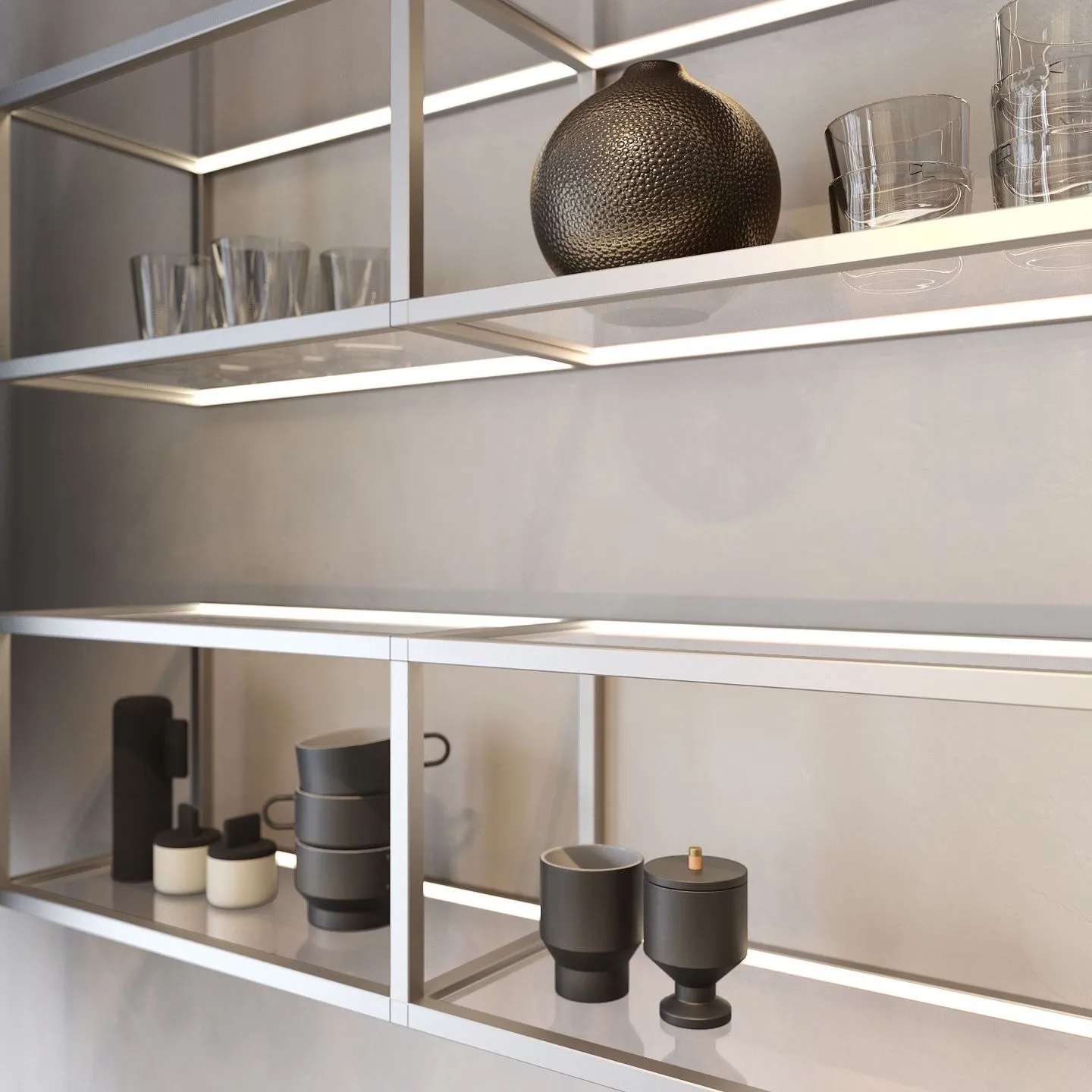 Материал основной рабочей поверхности и фартука — ламинат HPL, декор “Альпы”. Открытый сегмент создан на основе алюминиевых стоек Кадро в декоре “Матовое серебро” и стеклянных полок. Есть подсветка.