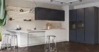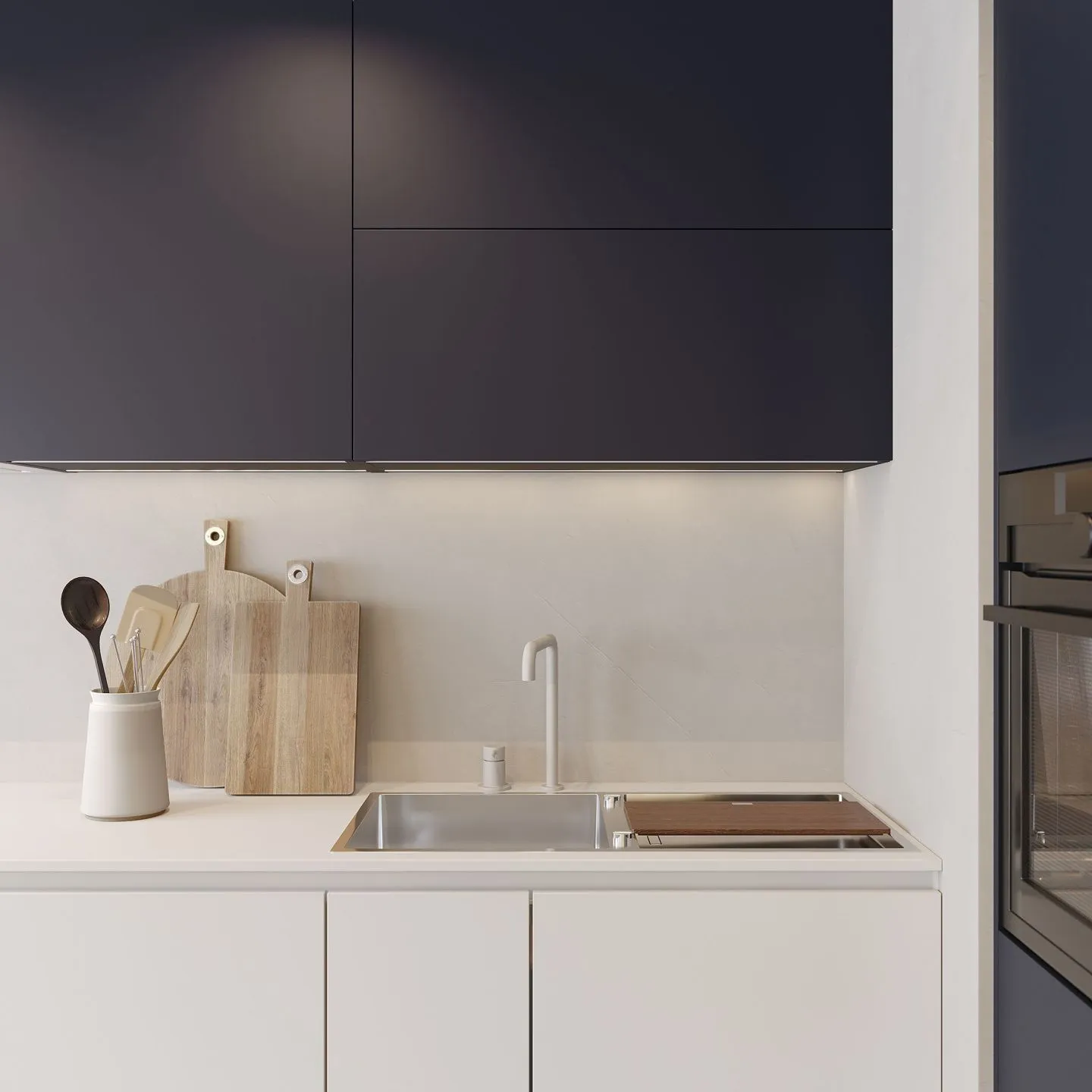 Корпус выполнен из ЛДСП в декорах “Графит” и “Алебастр”. Фасады и цоколи — МДФ в лаке из серии “Витра”. Для матовой отделки использован декор “Индиго” и “Альпы”. Использование профиля Gola белого цвета в отделке RAL5008 позволяет отказаться от использования ручек.