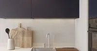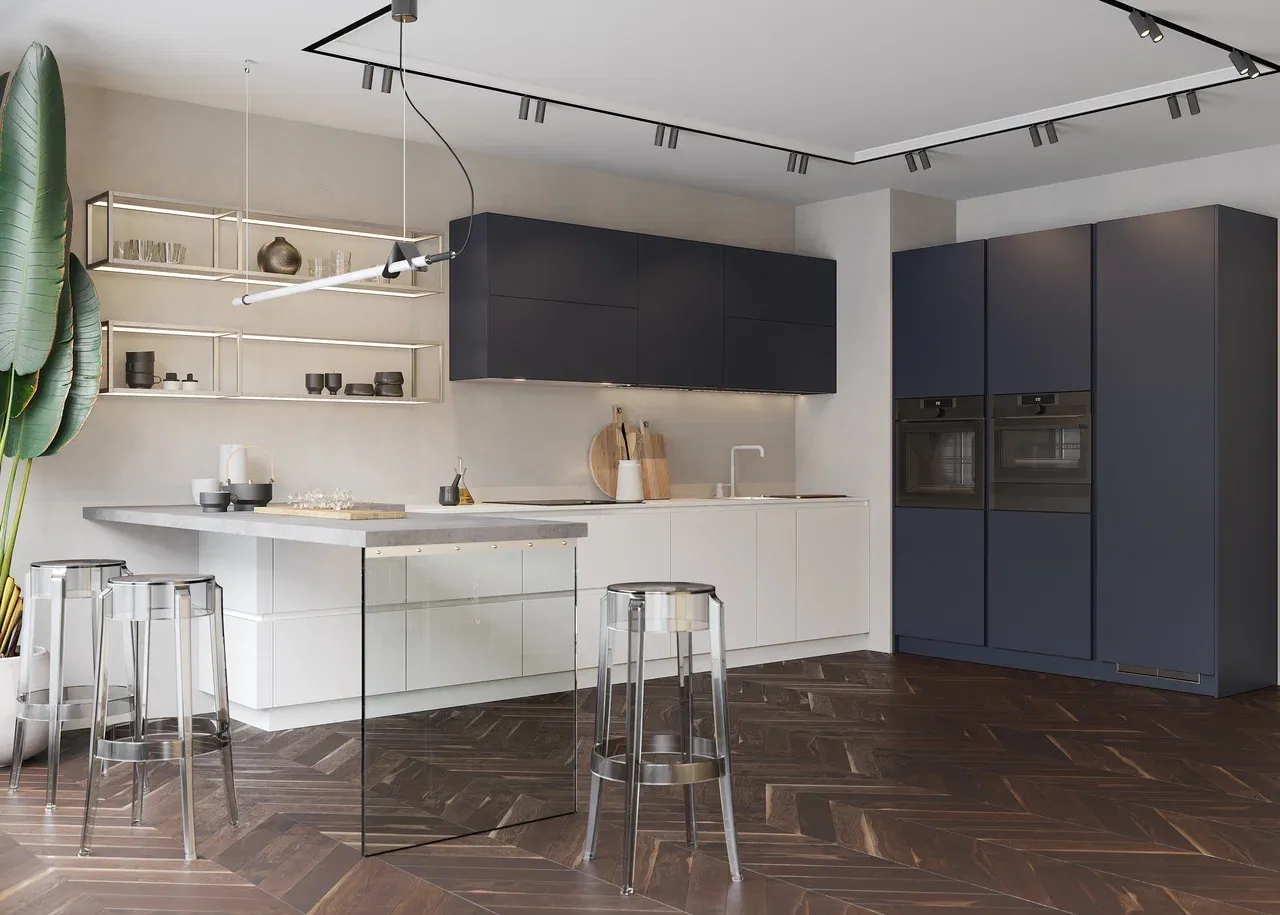 Современная кухня с барной стойкой — стильное и изящное решение для квартиры с любой планировкой, от классической до студии. Проект выполнен в соответствии с актуальными дизайнерскими трендами, он минималистичный, но практичный, места для приготовления пищи и хранения кухонной утвари достаточно. Сочетание синего и белого цветов позволяет гарнитуру гармонично выглядеть в любом интерьере.