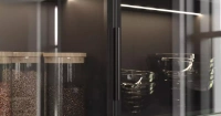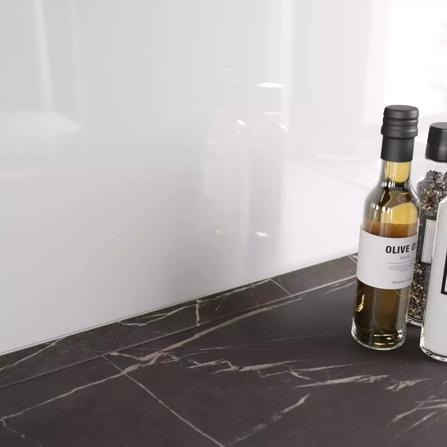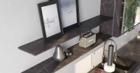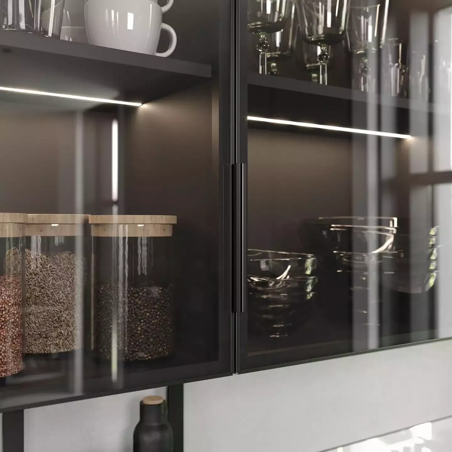 Корпус выполнен из ламинированной плиты в декоре «Графит». Благодаря использованию профиля Gola получилось обойтись без выступающих ручек — поверхность гладкая. Для создания фасадов использовался другой материал — МДФ в лаке (серия «Витра) в декоре «Камень Пьетра Гриджио антрацит». Аналогичный декор использован для столешницы, сделанной из ламината HPL Price Minus. Боковая опора стола — «Ligron», создана из прочного стекла.