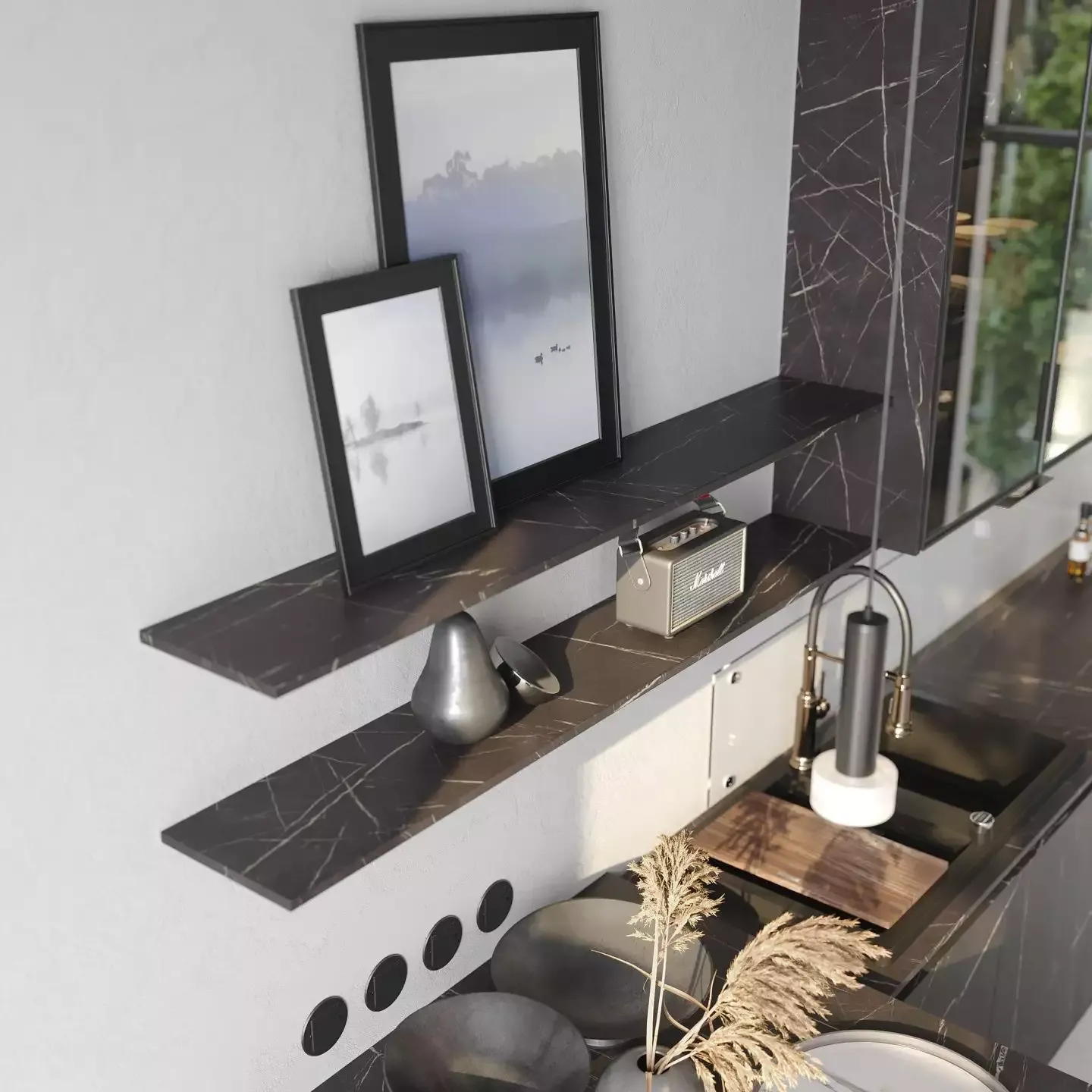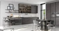 Просторная кухня в современном стиле и тёмном оформлении украсит любое помещение. Оригинальный рисунок, воспроизводящий узоры природного минерала, привлекает внимание и сам по себе является акцентом. Графитовый оттенок, который выступает базовым для гарнитура, удачно сочетается с любым дизайном интерьера. Количество мест для хранения и продуманная организация пространства делают проект подходящим и для квартир-студий и для обычных кухонь.