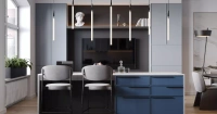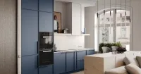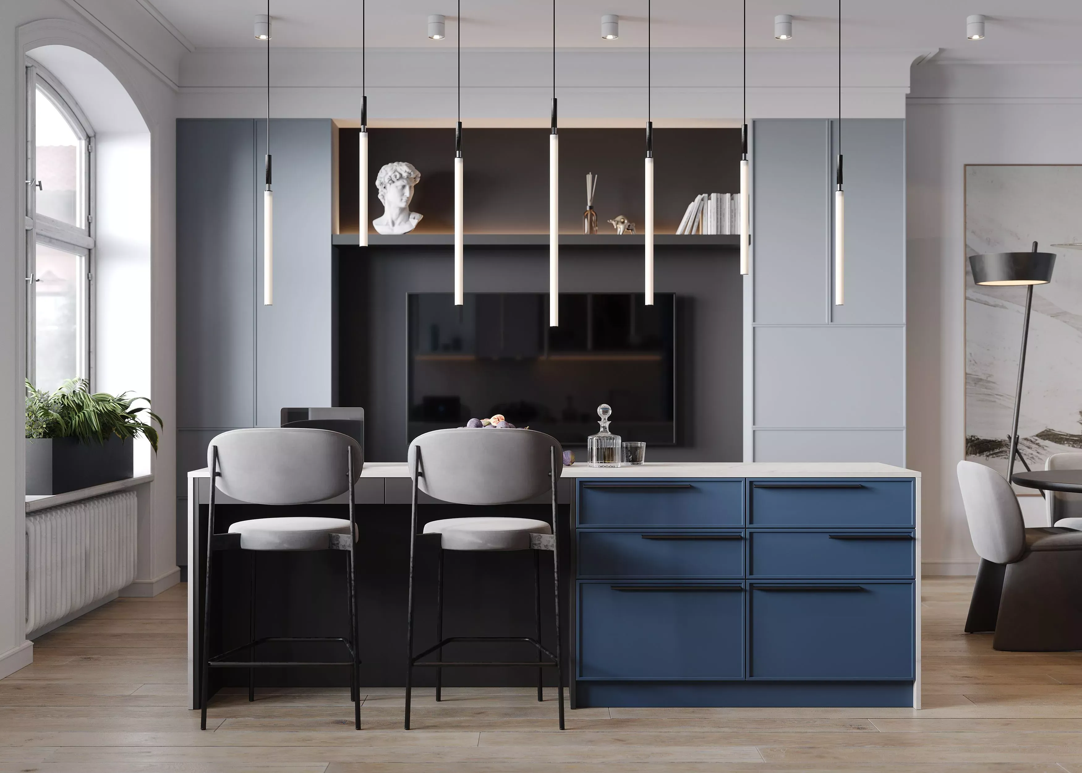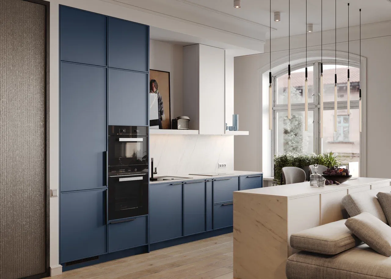 Прямая кухня с матовыми фасадами и островом ― прекрасный выбор для интерьера в современном стиле. Благодаря лаконичным матовым фасадам и насыщенной расцветке в спокойных синих тонах она смотрится изысканно и благородно. Такой гарнитур прекрасно подойдет к помещению, оформленному в стиле лофт или минимализм. Он достаточно вместителен, но не громоздок, а остров позволяет визуально разделить зоны приема и приготовления пищи друг от друга.