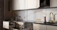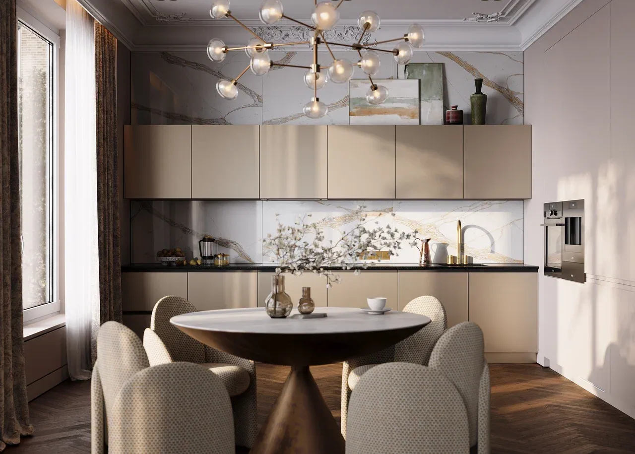 Фьюжн-кухня с кварцевой столешницей — где природная текстура камня встречает смелые контрасты стилей. Гармония хаоса и элегантности.