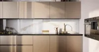Фасады из МДФ с металлическим Bronzo QB 49 и акцентами черной эмали — брутальный шик, игра света на бронзе и графичные контрасты. Современная кухня с характером.