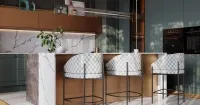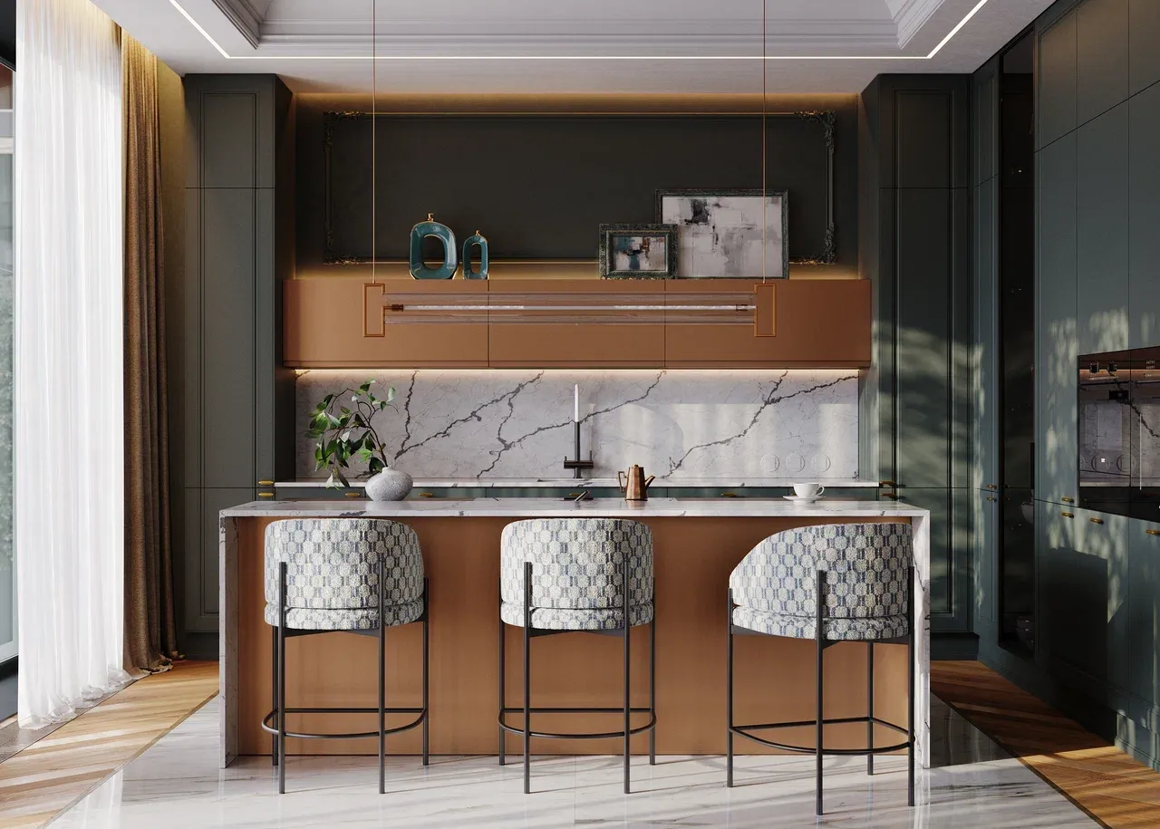 Неоклассическая кухня с островом и кварцевой столешницей — изысканный баланс современного шика и классической гармонии. Монументальные формы, благородные линии и глубокая элегантность натурального камня. «Современная классика, где роскошь кварца встречает безупречные пропорции».