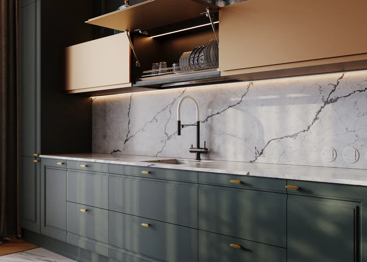 Кухня с кварцевой столешницей в стиле неоклассика