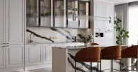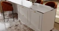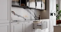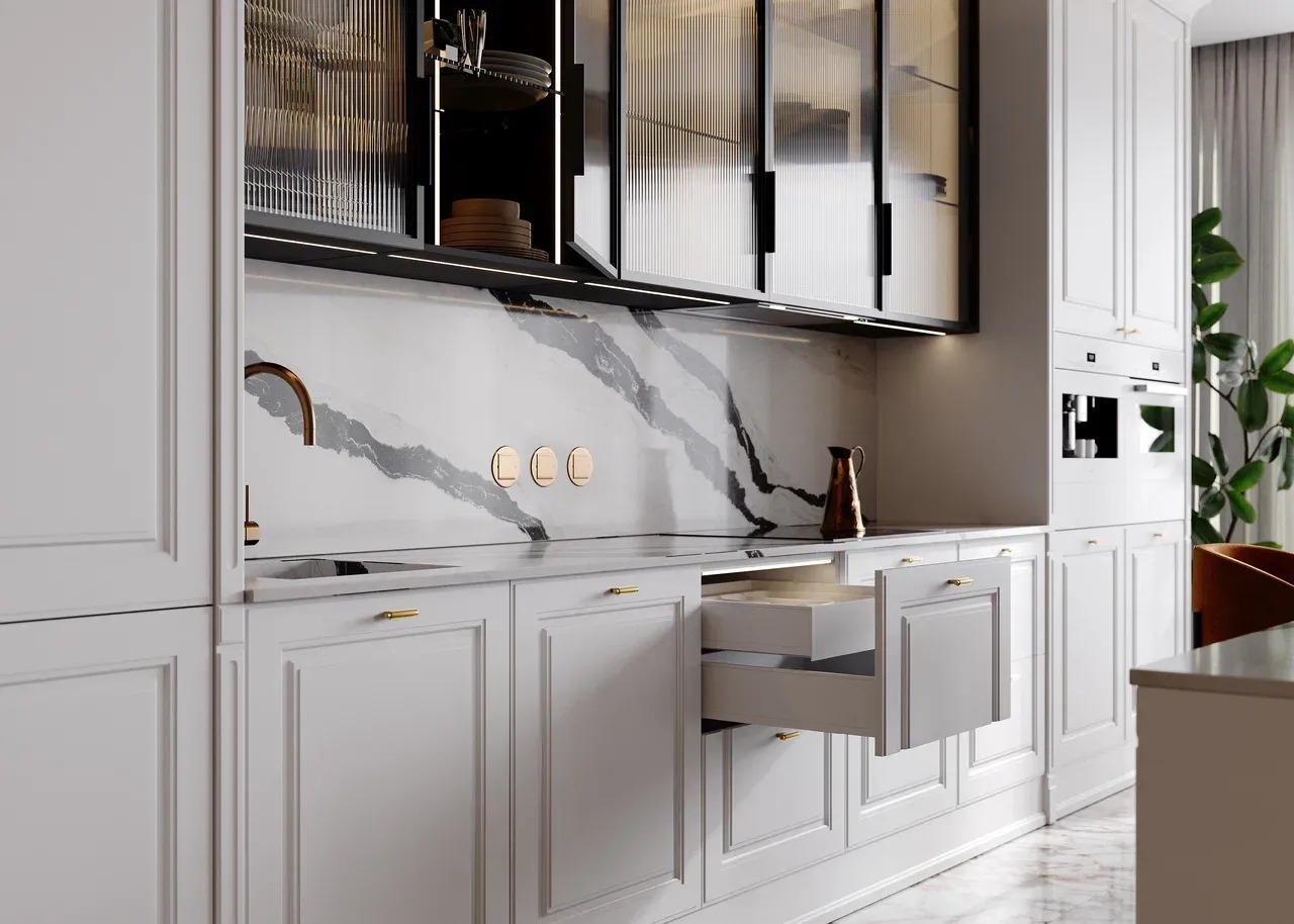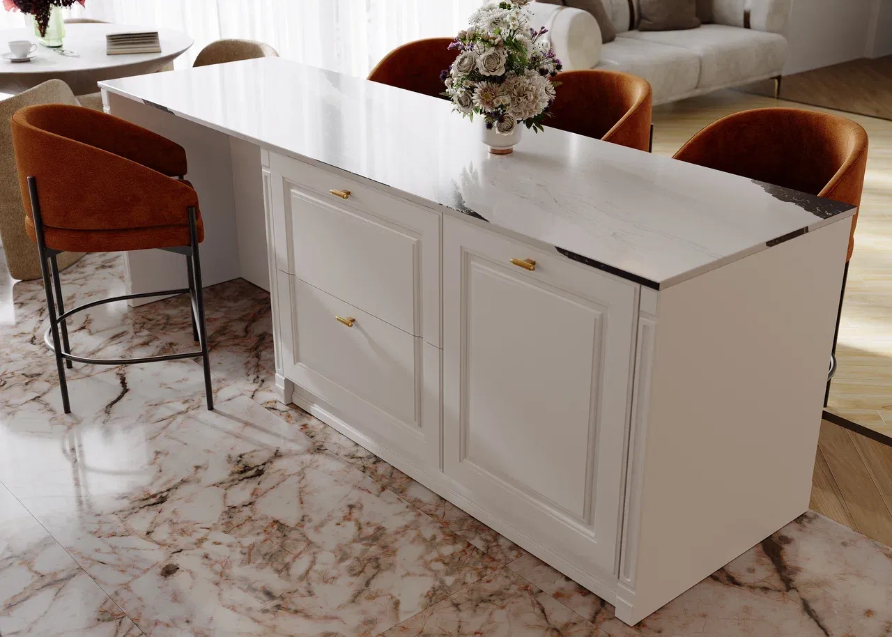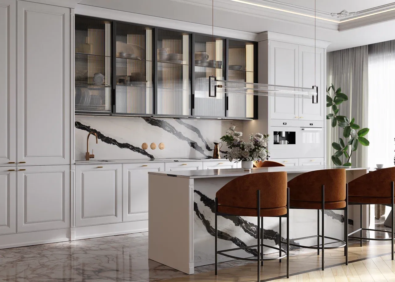 Светлая неоклассическая кухня с островом — кварцевая столешница с мраморным рисунком мягко сияет в обрамлении элегантных фасадов. Гармония воздушных тонов, античных пропорций и современной функциональности.