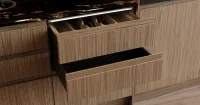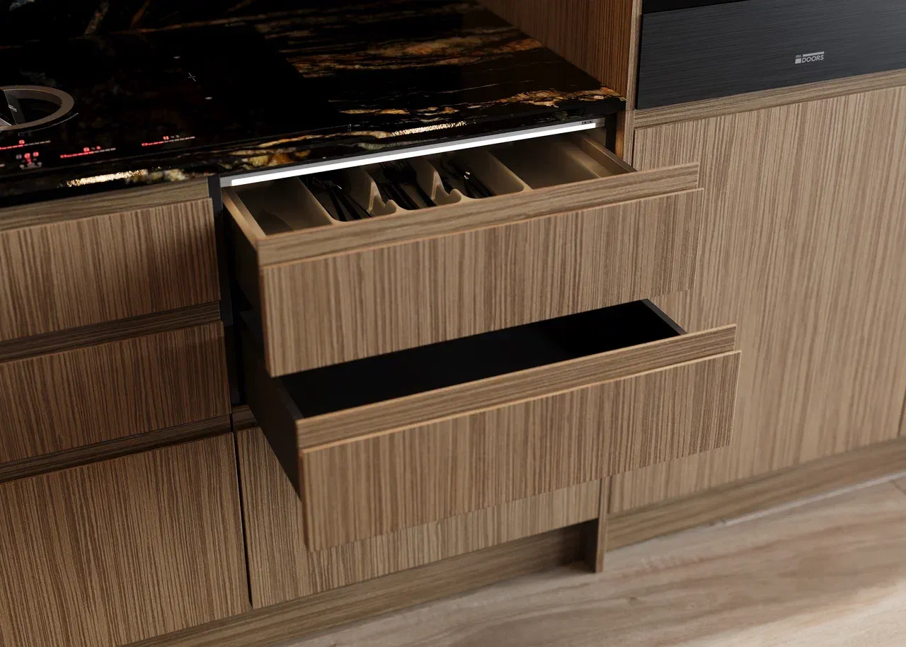 Элегантные фасады из МДФ в благородном оттенке 1018S Орех Тайгер дополнены изысканными эмалевыми декором по NCS — сочетание теплой натуральной текстуры и современной глянцевой утонченности. Идеальный баланс стиля и уюта.
