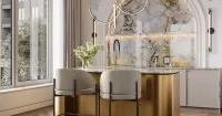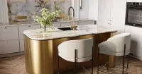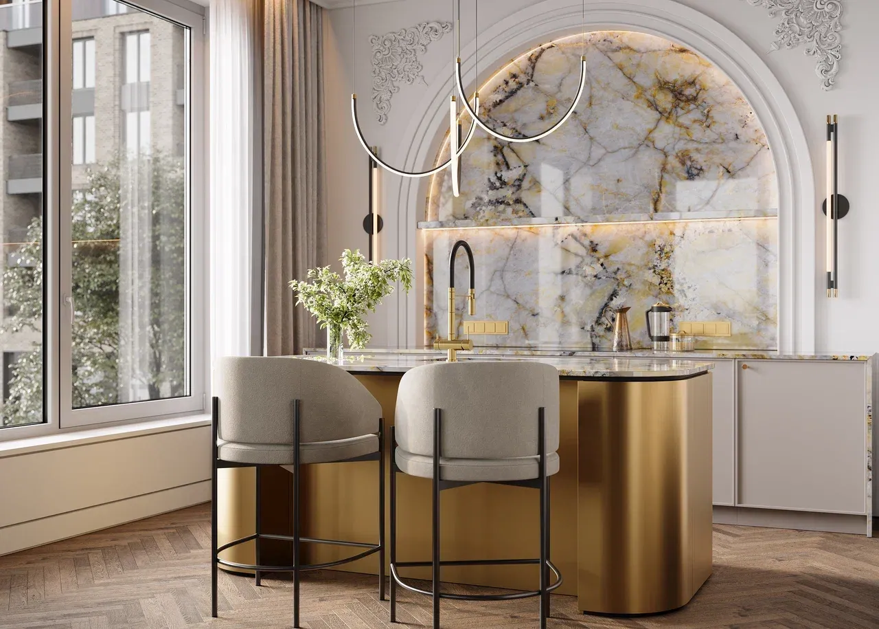 Неоклассическая кухня с островом и кварцитовой столешницей — гармония роскоши и сдержанности. Благородные линии, изысканная фактура натурального камня и безупречная функциональность. Тонкое сочетание традиции и современного комфорта.