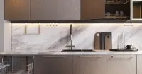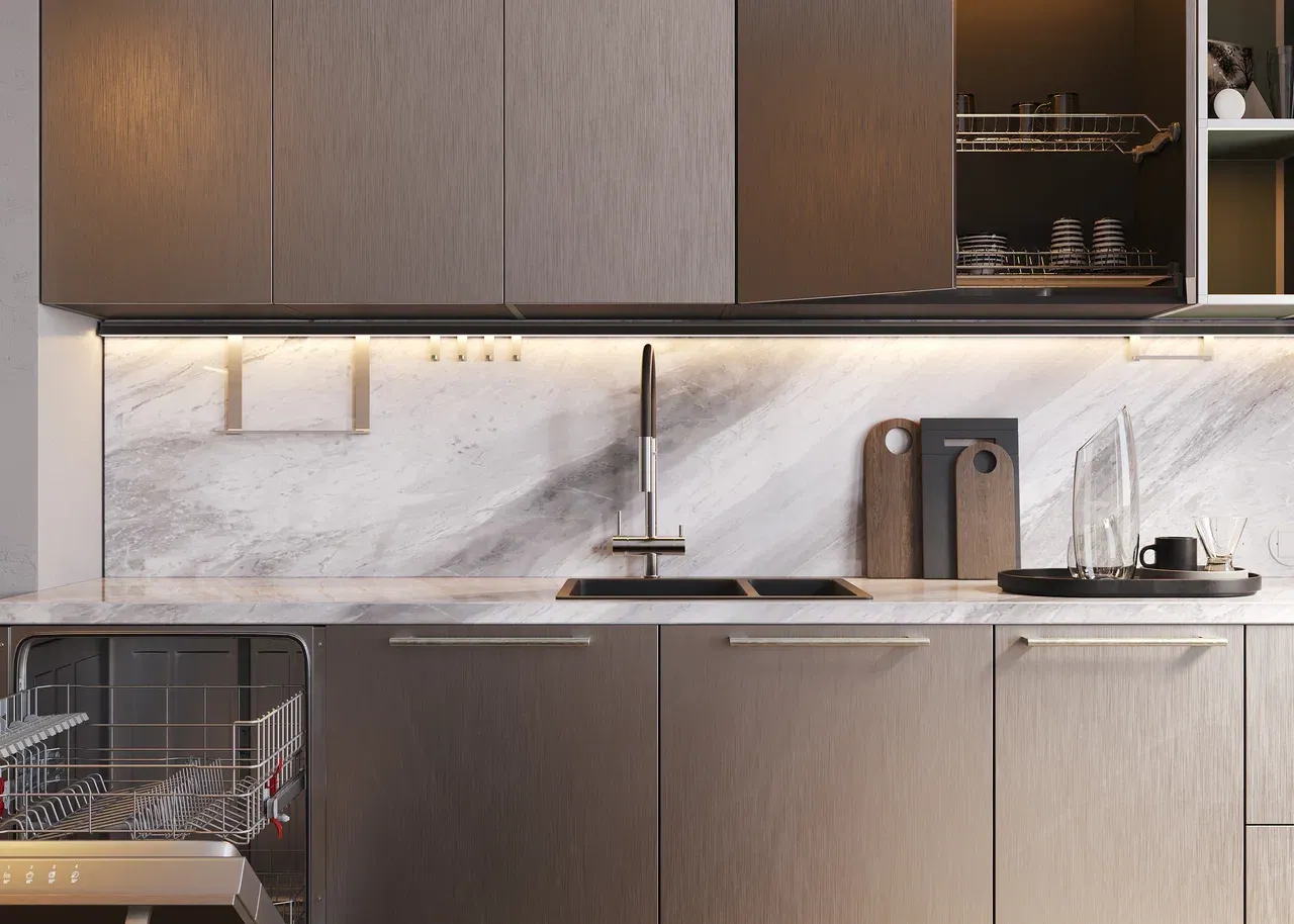 Декор столешницы выполнен в стиле “JT18 Бардилио серый глянец”, что придает ей элегантный и современный вид. Материал столешницы — искусственный кварцевый камень Jet Top, который отличается высокой прочностью и устойчивостью к царапинам.